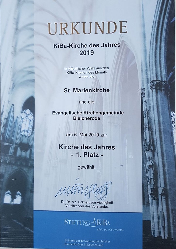 Am Samstag, dem 15.06.2019 erfolgte in Rostock die feierliche Preisverleihung der Stiftung KIBA Kirche des Jahres” an die St. Marien-Kirchengemeinde Bleicherode. Frau Babette Wolf und ich waren dazu zur KIBA-Mitgliederversammlung, in deren Rahmen die Preisverleihung stattfand, angereist. Der Preis wurde durch den Vorstandsvorsitzenden Dr. Dr. Eckard von Vietinghoff übergeben.