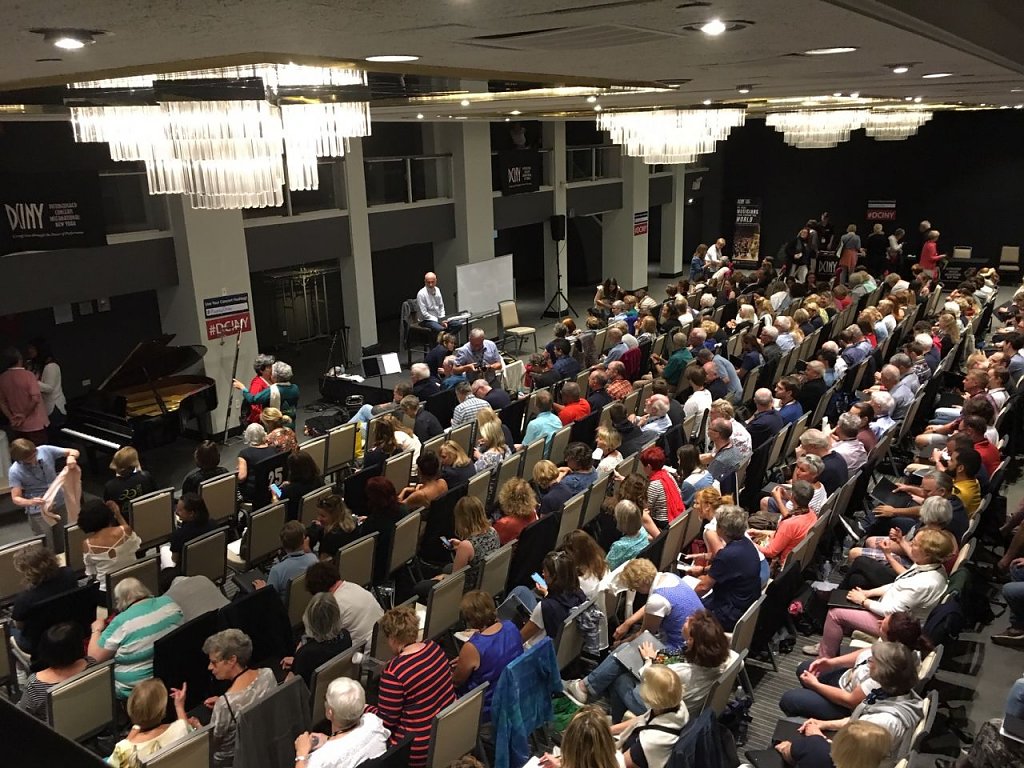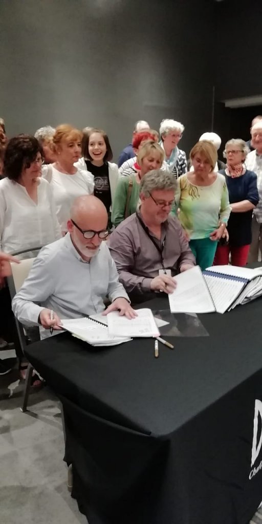 230 Sänger im Konzertdress bei strahlendem Sonnenschein vor dem Eingang und warteten geduldig auf Einlass. Doch dann war es endlich soweit, die Bühne gehörte den Sängern, die gemeinsam mit dem Komponisten am Klavier sein neustes Werk aus der Taufe hoben.
