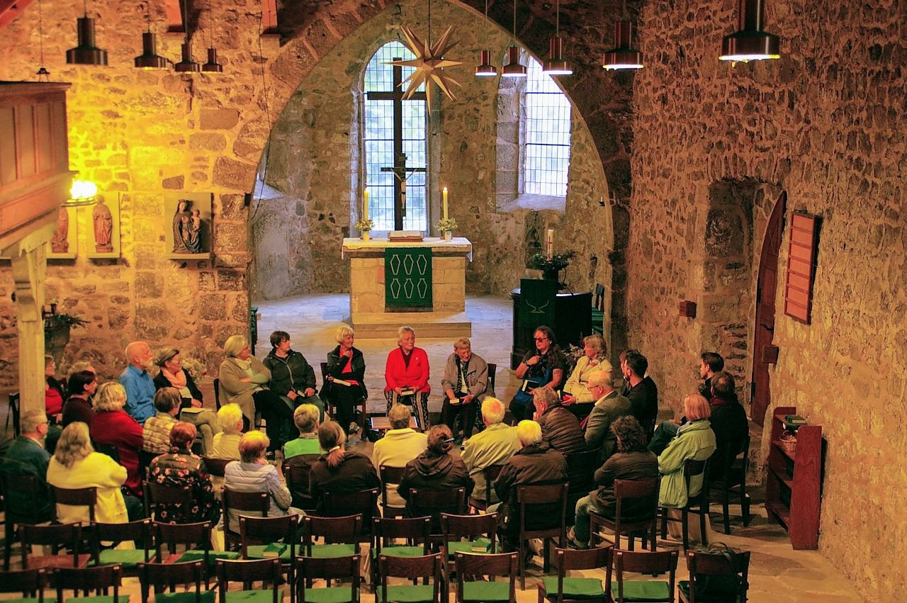 Letzten Dienstag fand wieder ein Hörkreis unter Leitung von Jürg Montalta statt. Eingeladen hatte der kleine Kreis der Ellricher Querdenker, die sich schon seit einiger Zeit so manches haben einfallen lassen – immer mit dem Ziel, die große Kirche auf dem Markt zur St. Johannes-Netzwerkkirche werden zu lassen. Diesmal waren wir in der schönen alten Frauenbergkirche.