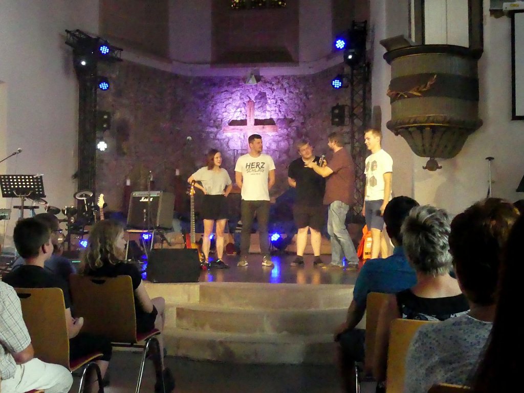Noch ungewöhnlicher wurde es, als Superintendent Andreas Schwarze im Talar den Altarraum betrat. Zum einen war jedem klar, dass es nun Ernst wurde mit der Verabschiedung von Simon Roppel und zum anderen war dieser Anblick nach dem faithtime mit Band und bunten Lichtern schon fast ein aus der Zeit gefallener Anblick. Hier trafen zwei Formen Gottesdienst zu feiern aufeinander, die sehr verschieden und doch im Kern identisch sind. Simon wurde übrigens noch ein atemberaubendes Geschenk übergeben - zwei Gutscheine für Harzdrenalin. Aber wer die Freizeiten kennt, die er durchgeführt hat, der weiß, dass ihn das auch nicht schreckt.