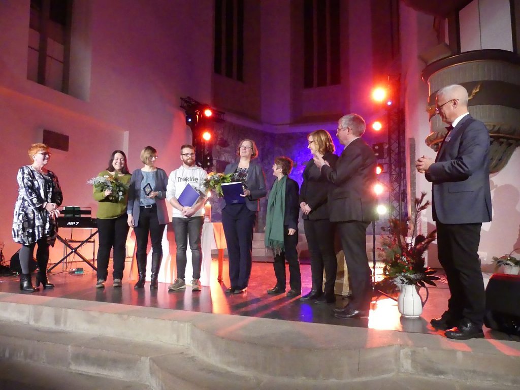 Rund 170 Menschen aus Politik, Wirtschaft, Gesellschaft und Kirche erlebten die Preisverleihung live in der Jugendkirche. Der neue katholische Pfarrer Steffen Riechelmann war genauso anwesend, wie der zukünftige Jugendreferent des Kirchenkreises Marcus Bornschein, Landrat Matthias Jendricke, Sparkassenvorstand Wolfgang Asche, Vertreter der Ökumene, Bürgermeisterinnen und Bürgermeister aus Städten und Gemeinden, Geschäftsleute, Pfarrerinnen und Pfarrer sowie die Vorsitzenden der Gemeindekirchenräte. Zuvor hatten sie dem geistlichen Wort von Superintendent Andreas Schwarze und dem Impuls von Gisela Hartmann gelauscht. Hartmanns Rückblick auf die "Friedliche Revolution" und die Rolle der Altendorfer Kirche dabei fasste Superintendent Schwarze mit einem wunderbaren Satz aus den Seligpreisungen 1989 zusammen: Selig sind die Sanft-Mutigen!