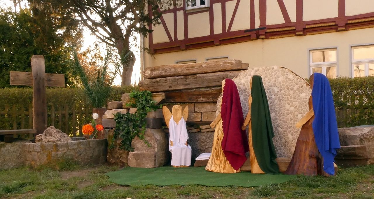 Auf dem Kirchplatz ist ein großes Ostergrab aufgebaut worden. Bei einem Spaziergang kann man es leicht schon aus der Ferne entdecken.