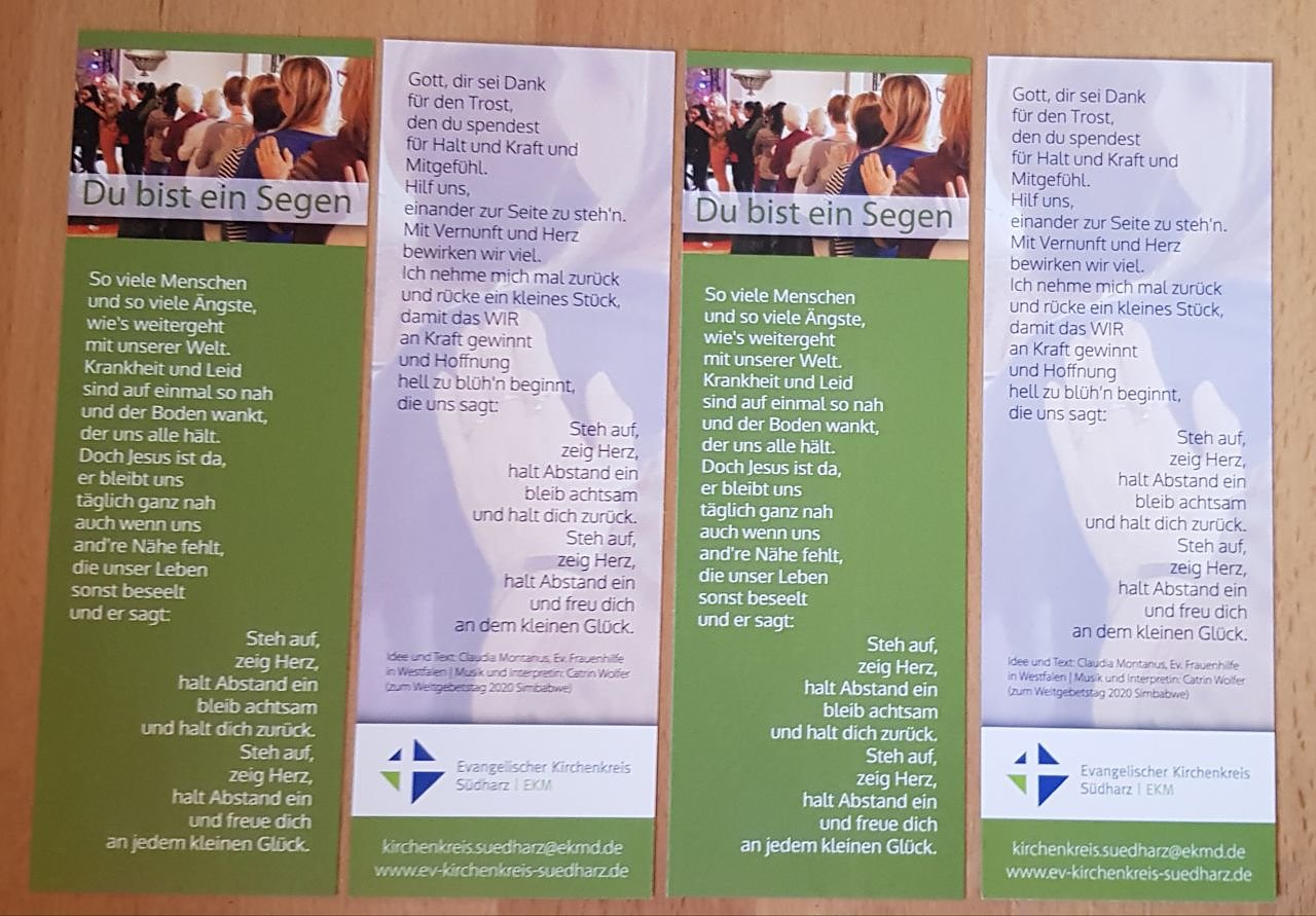 Die Idee des Lesezeichens war schnell geboren. Bedruckt ist es mit einem Liedtext von Claudia Montanus, einem Mitglied des deutschen Weltgebetstagskomitees. Sie hat ein diesjähriges Weltgebetstagslied aus Simbabwe zum Coronaweltgebetstagsmutmachlied umgeschrieben. Die beiden Strophen und der Refrain spiegeln die aktuelle Zeit und machen Mut. Steh auf, zeig Herz, halt Abstand ein bleib achtsam und halt dich zurück… heißt es im Refrain. Das Bild, das Kathrin Schwarze dazu wählte ist ein starkes Symbol. Frauen stehen hintereinander und legen sich die Hände segnend auf die Schultern. Ein Bild, das beim letzten Oasentag für Frauen im Kirchenkreis entstand – die Frauen hatten sich zum Abschluss der Veranstaltung den Engelsegen zugesprochen. Viele berichteten hinterher, dass dieser Segen eine Kraftquelle für sie war und trugen ihn in ihre Gemeinden. Nun soll er es mit diesem Lesezeichen wieder sein.