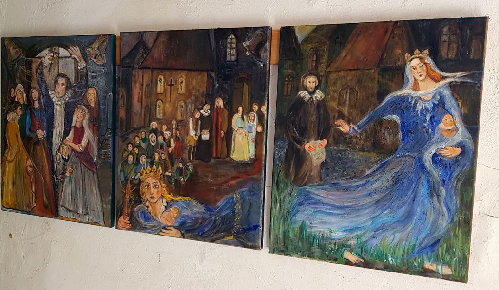 Nach dem Gottesdienst, gestaltet von Pfarrerin Annegret Steinke und Kreiskantorin Margarita Yeromina, wurde noch geschmaust. Crepes süß und herzhaft fanden zahlreiche Abnehmer. Die Wartezeit auf die Crepes bot Gelegenheit die drei neuen Bilder von Renate Aurin zu besichtigen. Drei Sagen der Rosenkirche hat sich die Bleicheröder Künstlerin dieses Mal als Thema gewählt. Sie sind die Ergänzung zu ihrem ersten Triptychon, das sie der Gemeinde zum 600. Kirchengeburtstag 2019 ebenfalls als Leihgabe überreichte.