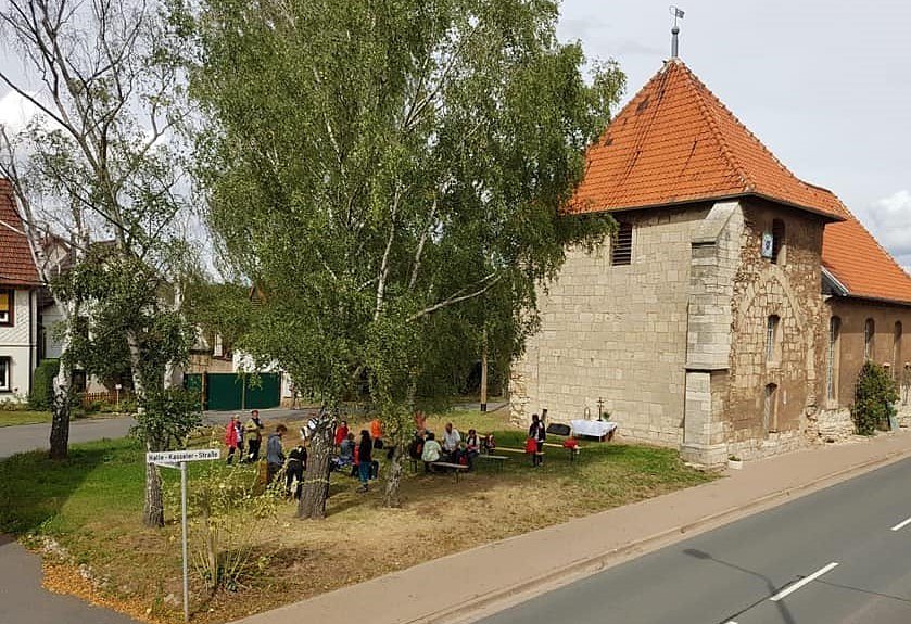 Den diesjährigen Pilgergottesdienst in Elende feierten am Samstag gut 50 Besucher. Sie kamen aus Heiligenstadt, Nordhausen, Ilfeld, Lipprechterode und den umliegenden Gemeinden. Allein 25 von ihnen waren in ökumenischer Gemeinschaft von Bleicherode aus wieder mit Dr. Christoph Maletz gepilgert. Einiges Neue erwartete sie in dem kleinen Dorf. Der Altar stand festlich geschmückt auf der Kirchwiese, neben ihm das E-Piano, ein Traktor brummte vorbei, die Vögel zwitscherten, die Menschen saßen mit Abstand auf der Wiese verteilt, teils gemütlich auf Decken. Alles anders als sonst und doch ein schönes Erlebnis für alle. Es war, als ob man von der Musik, den Gebeten und dem Segen förmlich umweht wird, ist Regina Englert vom Gemeindekirchenrat begeistert. Auch der Wechsel auf den Samstag kam gut an. Endlich konnte ich einmal mitpilgern, sonntags ist das schwierig, berichtet eine katholische Pilgerin aus Nordhausen fröhlich. Für allseitige Überraschung sorgte bei diesem Gottesdienst das hygienekonforme Agapemahl. Ein Stückchen Brot und eine Traube, zusammengehalten von einem Bambusspießchen lagen auf einer Pilgermuschel. Ach, wie schön, entlockte der Anblick so manchem Pilger.
