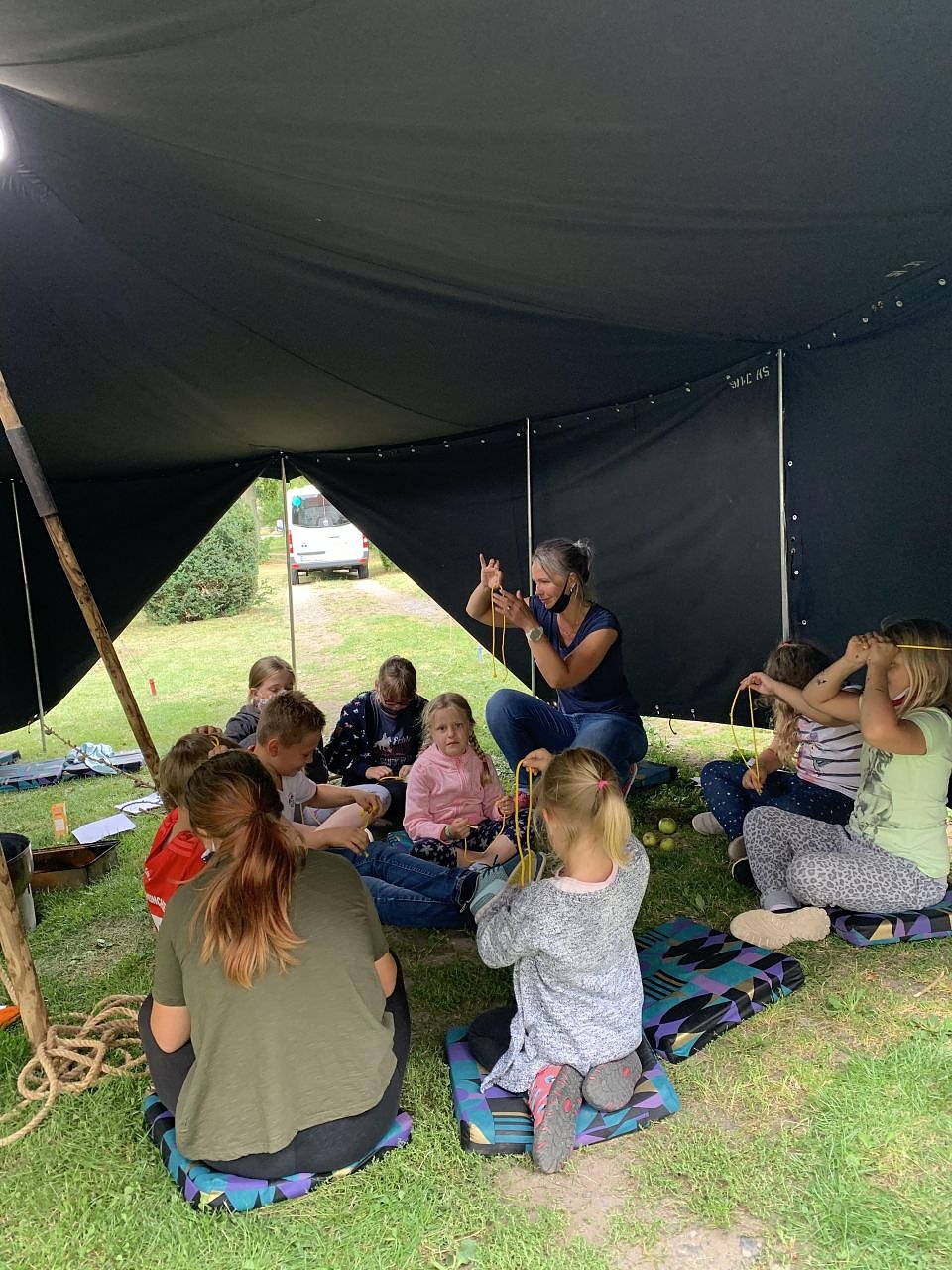 Nach dem reichhaltigen Mittagessen und einer kleinen Verschnaufpause ging es dann zu den Nachmittagsaktivitäten, an denen mit großer Begeisterung teilgenommen wurde. Um Abstand und Hygienevorschriften einhalten zu können wurden die Teilnehmenden in zwei Gruppen geteilt. Während die eine Gruppe über dem Lagerfeuer Brennnesselchips und Bratäpfel herstellte, bemalte die andere Gruppe Steine, welche für den nächsten Tag wichtig waren. Denn am Dienstag ging es in den Wald! Neben ein paar kniffligen Kleingruppenspielen und einem Aufstieg in die Bleicheröder Berge, bauten die beiden Gruppen jeweils eine Murmelbahn mit allem, was sie im Wald finden konnten. Die bemalten Steine sollten während der Wanderung am Wegesrand platziert werden und somit anderen Passanten ein wenig Freude schenken. Der Sturm am Mittwoch machte und zwar ein wenig Sorgen, hielt uns letztendlich aber nicht in Schach. Über dem Lagerfeuer wurde frischer Apfelkuchen gebacken und es wurden kleine Holzfische bemalt, welche dann am Freitag zur Schulanfängerandacht verschenkt wurden.