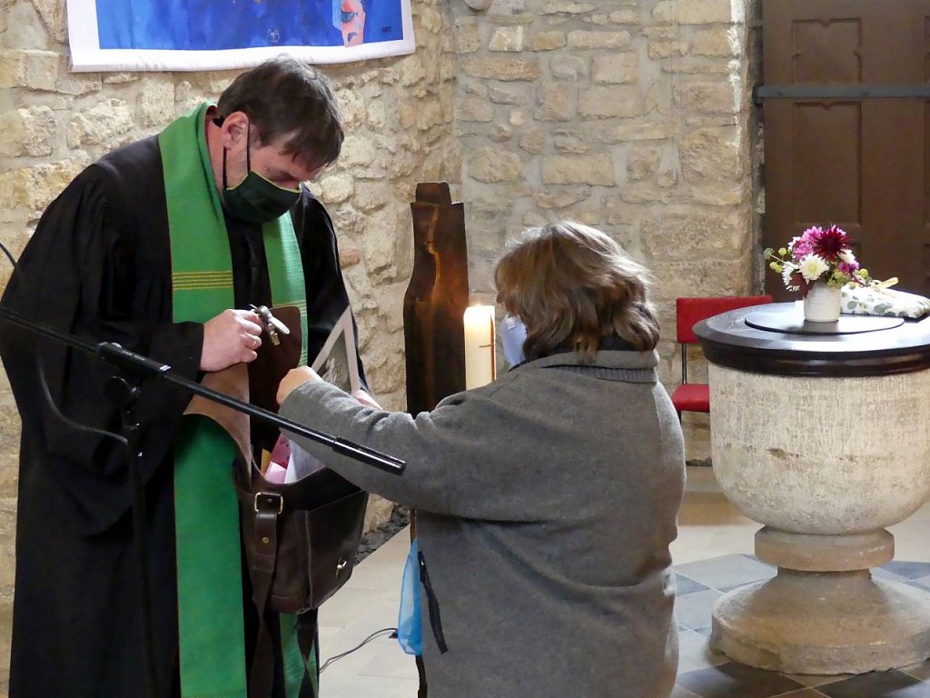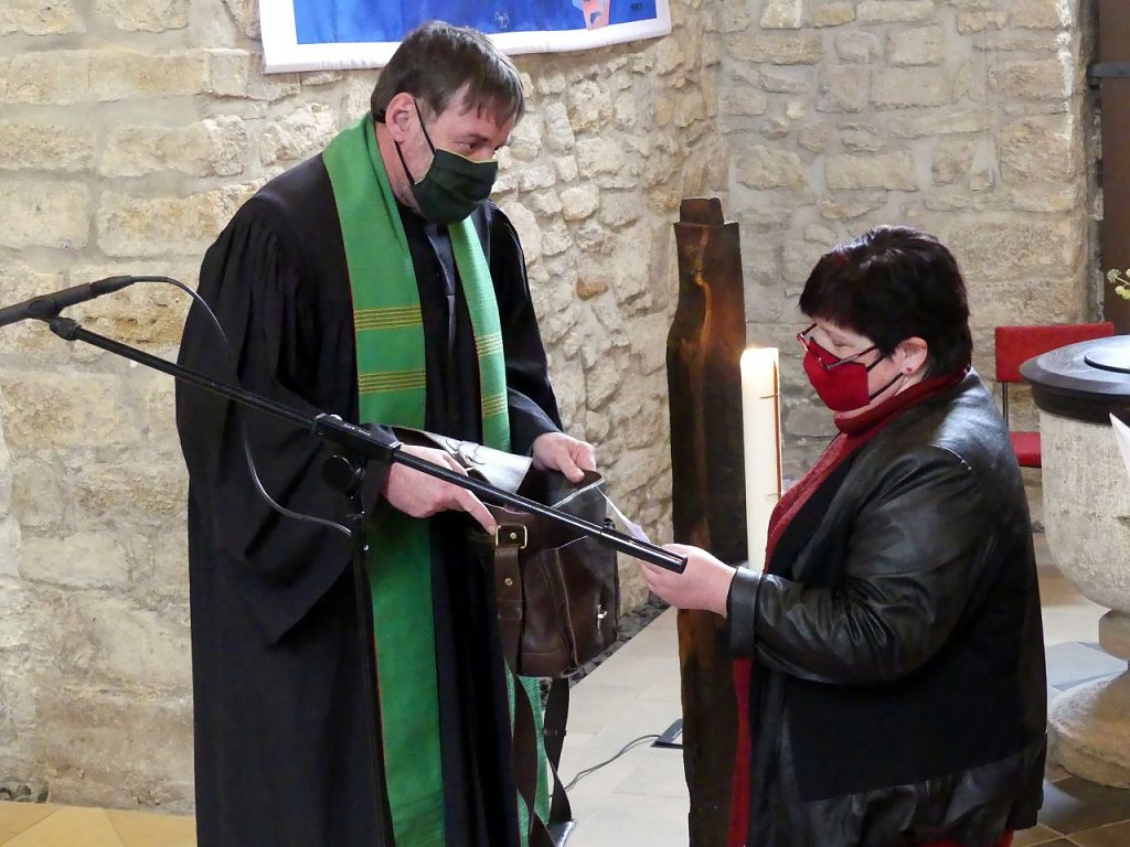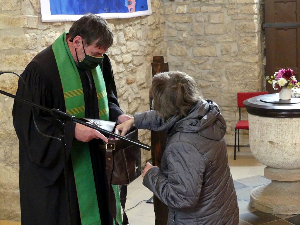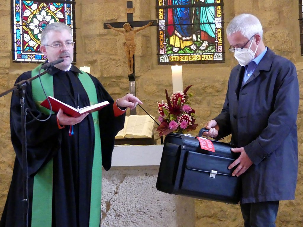 Wie groß das Lob auch sein mag, Pfarrer Heizmann bleibt am Sonntag ruhig und nachdenklich. Nur einmal, da sieht man ein herzhaftes Lachen hinter dem Mund-Nasenschutz. Lektorin Roswitha Böck aus Bernterode zückt da gerade eher widerwillig ein Päckchen Zigaretten. Es soll als Erstes die neue Ledertasche füllen, die der Pfarrer von seinen Gemeinden als Ersatz für seinen alten Beutel bekommen hat. Dass der legendäre Beutel irgendwie alle beeindruckt hat, zeigt auch das Geschenk des Pfarrkonvents. Ein Pilotenkoffer für die zukünftige Tätigkeit wird von Superintendent Andreas Schwarze überreicht. Der Alte hat ausgedient, kommentiert Schwarze schmunzelnd. Gefüllt wird der Koffer von Präses Dr. Uwe Krieger mit einer exklusiven Sonderausgabe der Nordhäuser Traditionsbrennerei.