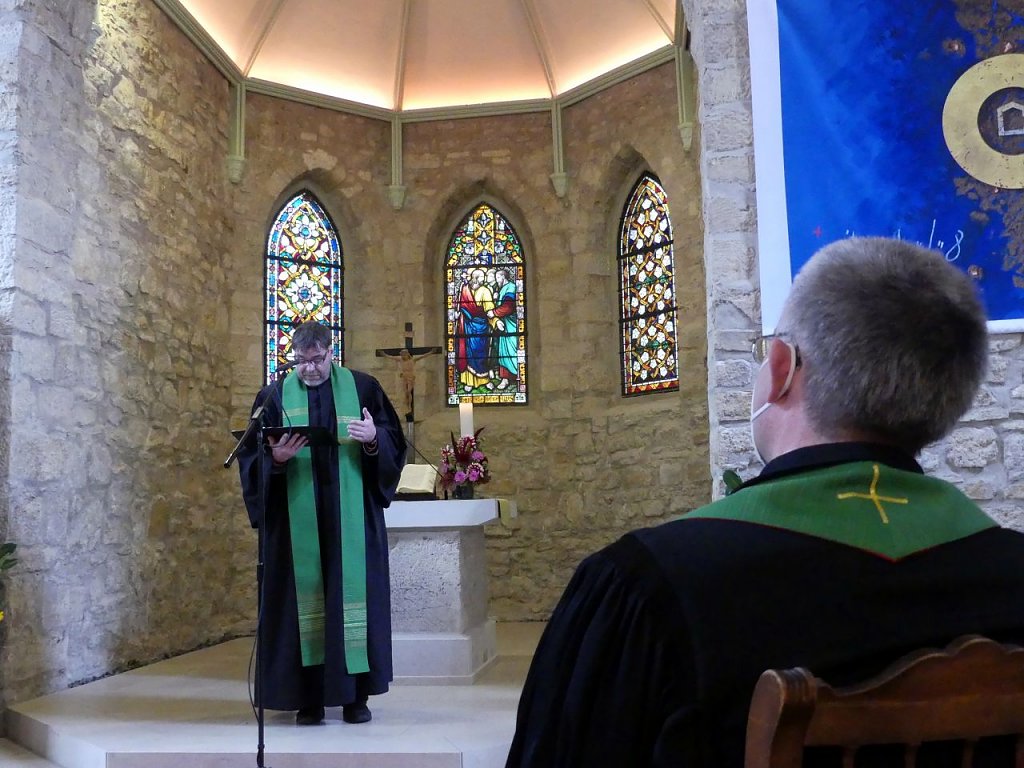 Superintendent Andreas Schwarze entpflichtet in diesem Gottesdienst seinen bis dato 1. Stellvertreter schweren Herzens aus seinem Dienst im Kirchenkreis. Was sonst mit einem Handschlag besiegelt wird, geschieht dieses Mal coronagerecht mit einem Ellenbogenkick der beiden Männer. Doch das ist nur der formelle Teil.