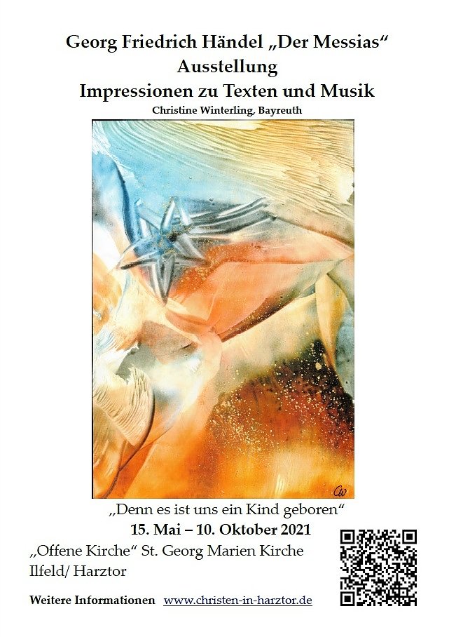 Seit dem 15. Mai ist in der Ilfelder St.-Georg-Marien-Kirche ein Bilderzyklus zu Georg Friedrich Händels Oratorium Der Messias ausgestellt. Bis Oktober gibt es dort dann etwas zu sehen und zu hören. Bilder in außergewöhnlicher alter Technik geschaffen, Musik und QR-Codes zum Mitsingen erwarten die Besucher. Nachdem die geplante Aufführung des Oratoriums mit Chor und Orchester pandemiebedingt terminlich nicht vorhersehbar ist, geht die Gemeinde diesen Zwischenschritt. Sie möchte mit ihrem Kunstprojekt ein Zeichen der Ermutigung in dieser Zeit setzen. Aktuell erklingt eine CD im Kirchenraum und im Laufe der nächsten Wochen kann man anhand von QR-Codes die Übstimmen für die Chorstücke mit dem Smartphone scannen, mitsingen und nach Hause tragen, erklärt Christine Heimrich den musikalischen Teil.