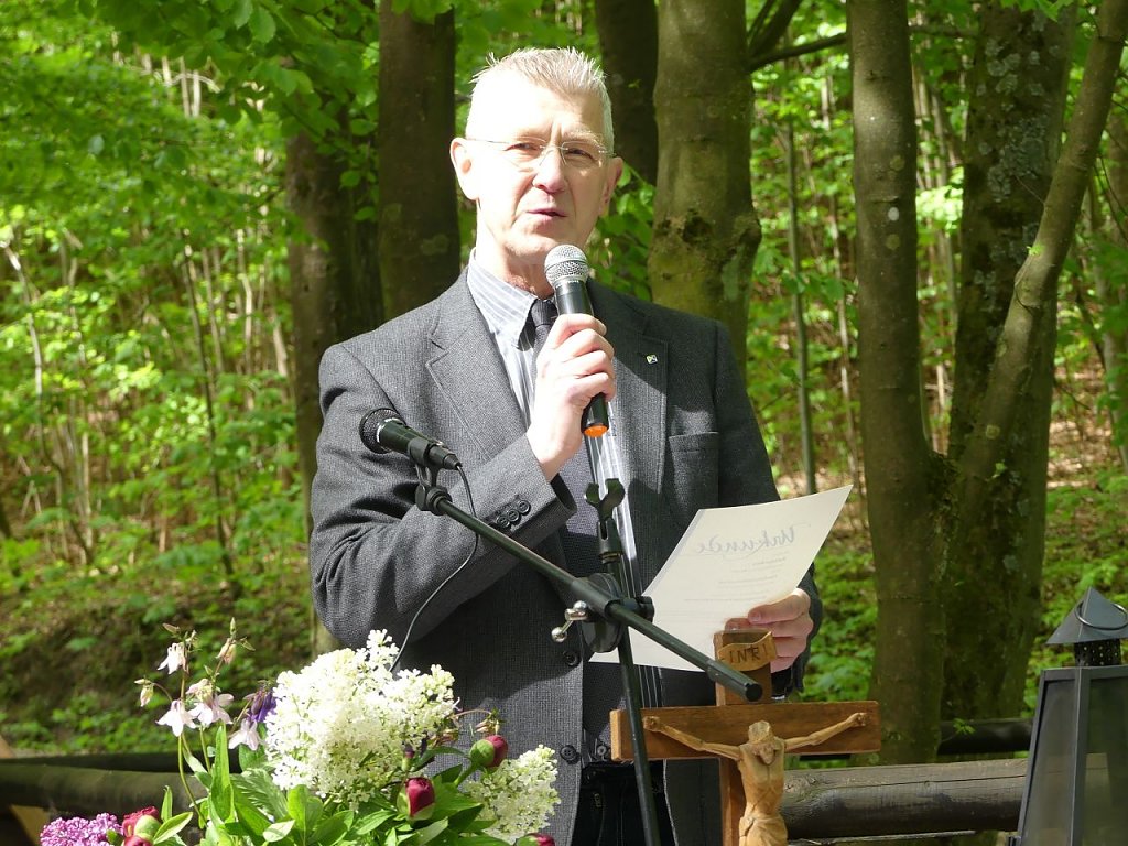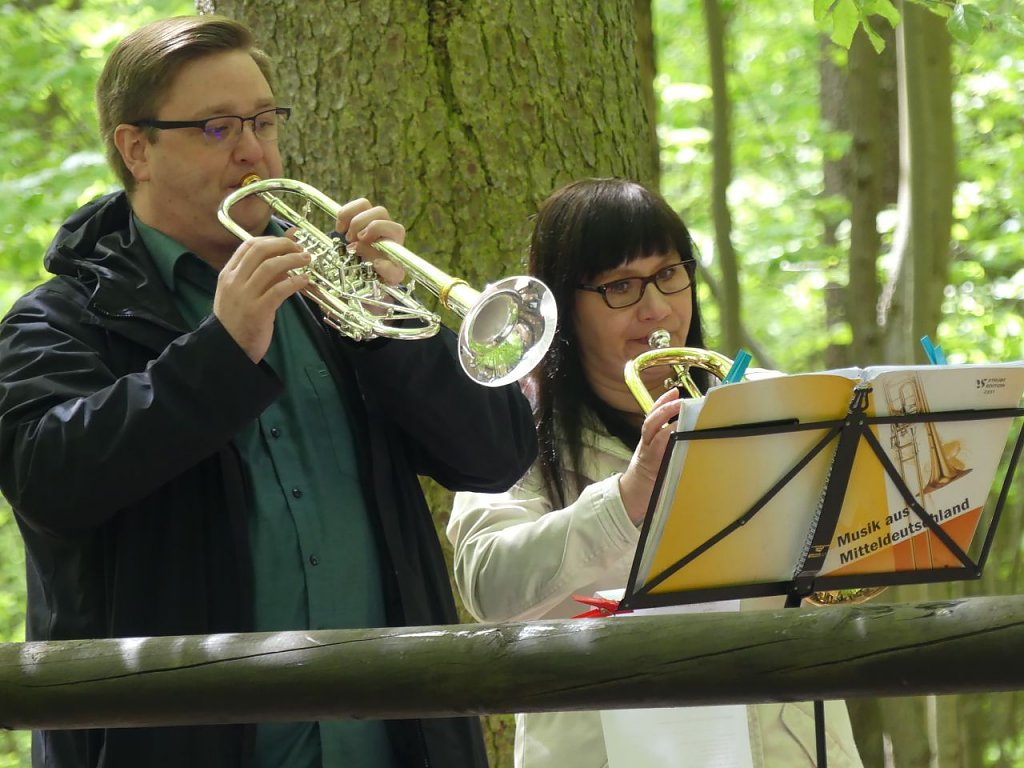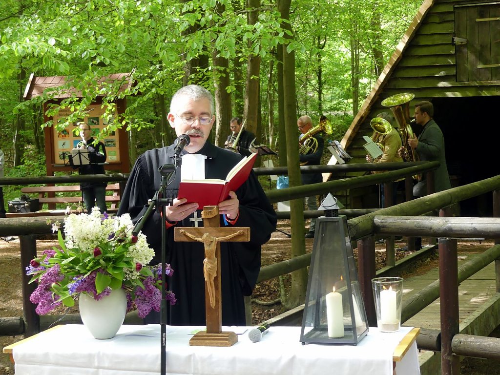 Der regionale ökumenische Pfingstmontagsgottesdienst am Kuhbrunnen in Bleicherode hat eine lange Tradition. Doch, dass hier mitten im Wald ein evangelischer Pfarrer in seinen Dienst eingeführt wurde, daran konnte sich keiner der Gottesdienstteilnehmer erinnern. Nicht nur coronabedingt empfanden jedoch viele der Anwesenden die Wahl dieses Ortes als sehr schöne Idee. Oft hat man hier schon gemeinsam Taufen gefeiert. Pfarrer Matthäus Monz wurde dort nun in seinen Dienst im Pfarrbereich Bleicherode mit den Gemeinden Bleicherode, Lipprechterode, Kraja und Kleinbodungen eingeführt. Genau einen Tag bevor sich seine Ordination zum 7. Mal jährt. Ein weiterer Grund für ihn, diesen Gottesdienst im Wald nicht mehr zu vergessen. Gemeinsam mit Superintendent Andreas Schwarze segneten die Assistenten Dr. Christoph Maletz, der Vorsitzende des Gemeindekirchenrates, der Niedergebraer Pfarrer Michael Steinke, der die Vakanzvertretung übernommen hatte und der katholische Pfarrer Hermann-Josef Seideneck den neuen Bleicheröder Seelsorger. Monz anschließende Predigt erzählte unteranderem von seinem Lieblingsverein SCHALKE 04. Teamplayer scheinen die nicht so wirklich zu sein, sonst wäre ihr Listenplatz wohl ein anderer, meinte der gebürtige Gelsenkirchener Monz nachdenklich. Aber Teamplayer, das müsse man in einer Kirchengemeinde sein. Es gebe so viele Gaben, die gemeinsam in die Stadt ausstrahlen könnten. Er möchte gern Teil dieses Teams sein.
