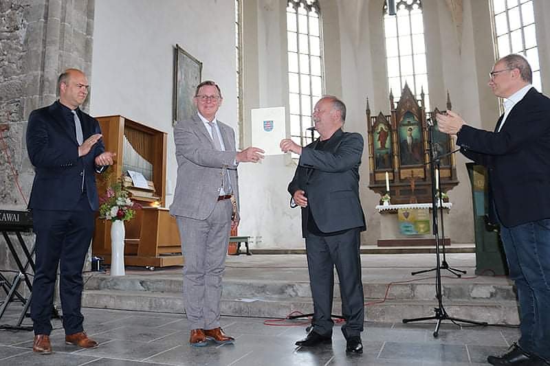 "Ministerpräsident Bodo Ramelow hat heute eine Förderung über 3,1 Mio. Euro an den Förderverein Wiederaufbau Glockenturm St. Johannis Ellrich für den Wiederaufbau übergeben. Landrat Matthias Jendricke freute sich mit den Ellrichern, die sich seit vielen Jahren für den Wiederaufbau engagieren. Der Glockenturm wurden zu DDR-Zeiten wegen ihrer Baufälligkeit abgerissen."