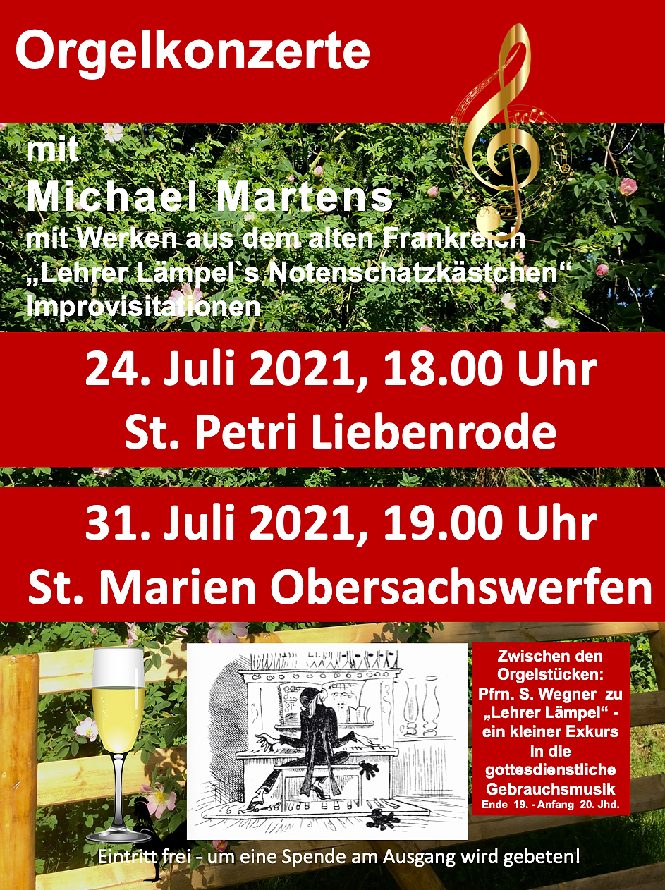 Zu zwei Orgelkonzerten laden die Kirchengemeinden St. Petri Liebenrode und St. Marien Obersachswerfen in ihre Kirchen am 24. Juli und 31. Juli 2021 ein.
