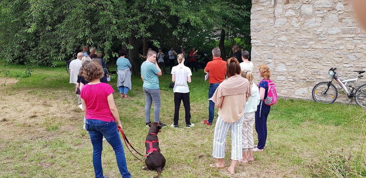 Donnerstagabend 19 Uhr ist nicht die klassische Gottesdienstzeit – trotzdem haben sich 20 Menschen aller Generationen auf den Weg zum Reisesegen zur Wegekapelle Elende aufgemacht. Der 22. Juli wird als der Tag in die Geschichte des kleinen mittelalterlichen Gotteshauses eingehen, an dem es wieder die erste Andacht nach rund 200 Jahren gab, freut sich die Förderkreisvorsitzende Regina Englert. Viele ließen sich im Anschluss an die Andacht noch einzeln segnen und nutzen die seltene Chance das kleine Gotteshaus von innen zu besichtigen. Noch kann die Gemeinde nur im Spettelgarten feiern, die Kapelle selbst ist noch nicht so weit saniert, dass es im Innenraum möglich wäre. Und doch ist es ein wunderbarer Neustart nach so langer Zeit. Der Niedergebraer Posaunenchor spielt, als Pfarrerin Annegret Steinke den Reisesegen pünktlich kurz vor Ferienbeginn spricht.