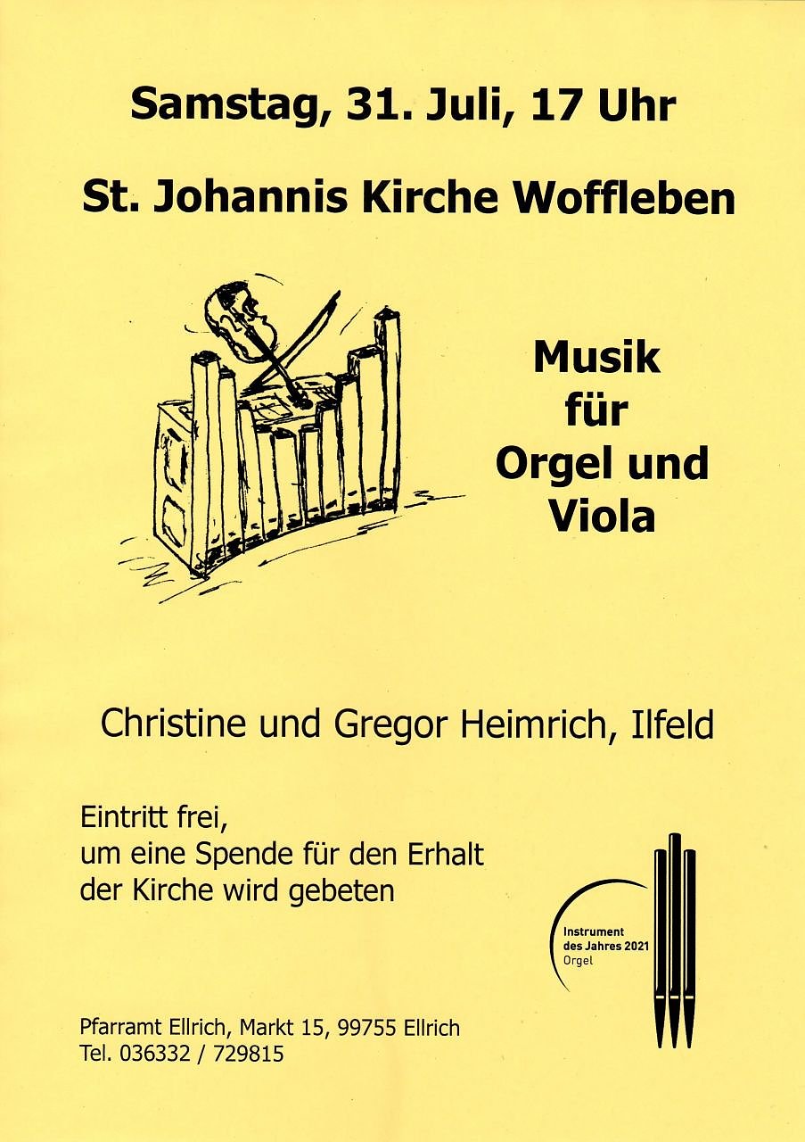 Am Samstag, 31.Juli, 17 Uhr, wird in die Kirche zu Woffleben eingeladen. Gregor Heimrich (Viola) und Christine Heimrich (Orgel) bringen Musik aus verschieden Epochen zu Gehör, darunter alte Orgelmusik des 16. Jahrhunderts, aber auch Gospelmusik, arrangiert für Orgel und Viola. Eine sogenannte Truhenorgel wird dafür im Altarraum der Kirche aufgestellt. Das ist ein transportables Instrument, welches im Kirchenkreis für Kammermusik zu Verfügung steht. Diese Veranstaltung ist ein Beitrag zum Jahr der Orgel (Instrument des Jahres 2021) Im Anschluß an die Veranstaltung kann man das Instrument auch aus der Nähe betrachten und ausprobieren. Der Kirchbauverein Woffleben lädt ausserdem zu einem Glas Wein u.a. ein. Der Eintritt ist frei, um eine Spende für den Erhalt der Kirche wird gebeten. Es gelten die aktuellen Hygienegeln.