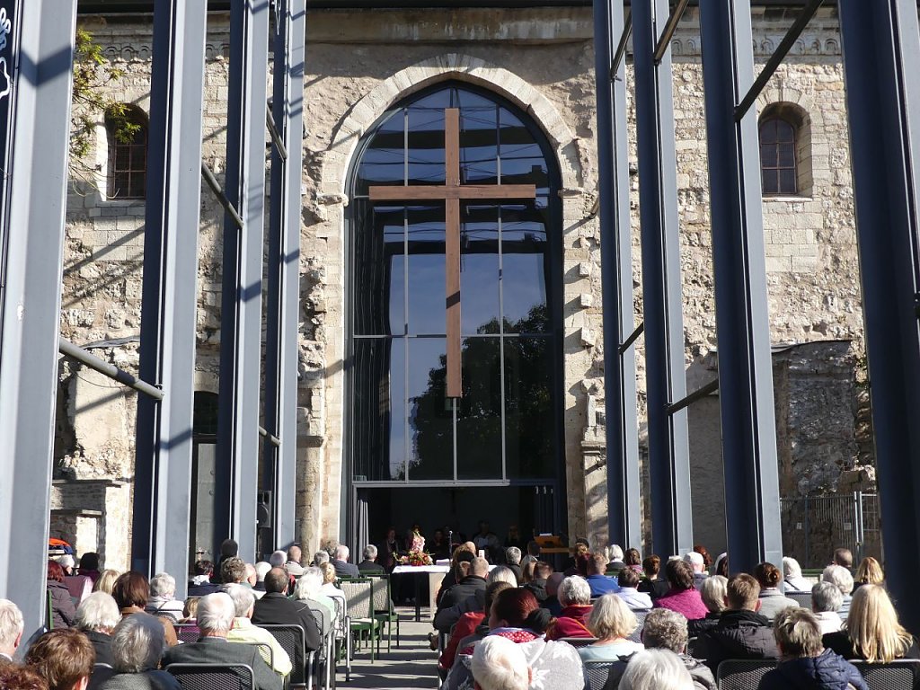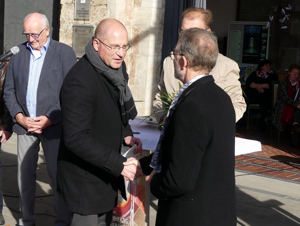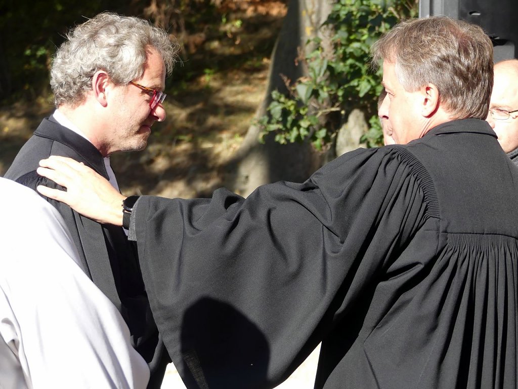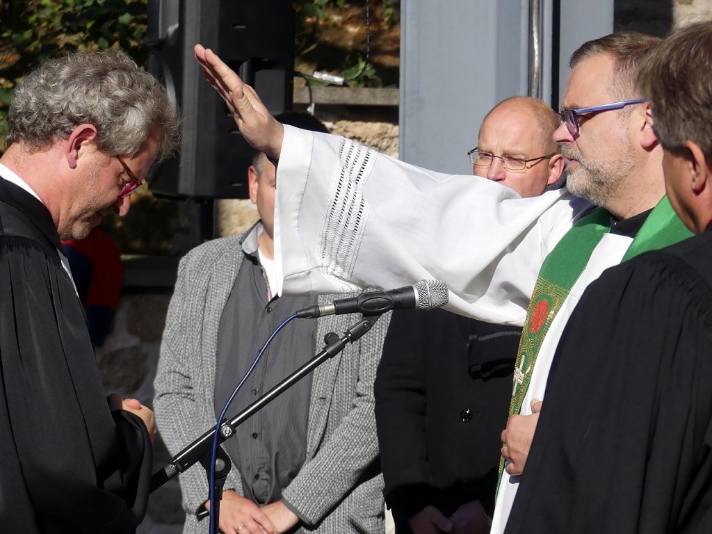 Nachdem Pfarrer Müller ein lautes "Ja, mit Gottes Hilfe" hat vernehmen lassen, darf er reichlich Grußworte und Willkommensgeschenke entgegennehmen. Und dies ganz in schöner ökumenischer Tradition auch von der katholischen Domgemeinde. Eine dienstliche Nachricht bringt Pfarrer Riechelmann gleich mit: "Unsere erste ökumenische Veranstaltung darfst du allein machen, ich kann nicht dabei sein." Pfarrer Müller quittiert die Ansage mit einem herzlichen Lächeln.