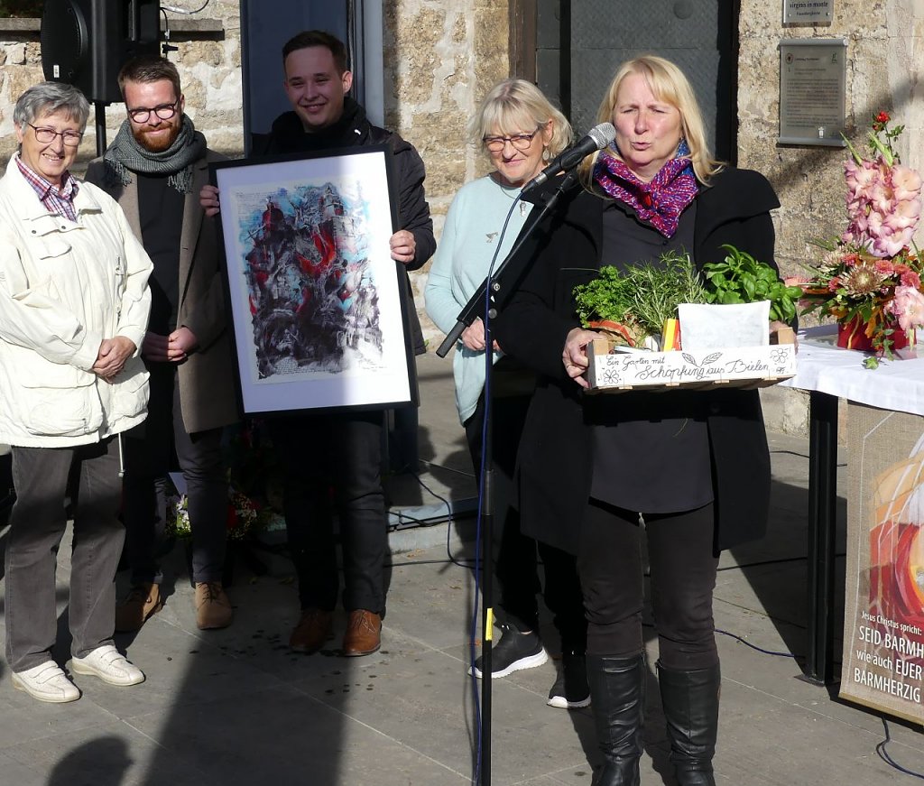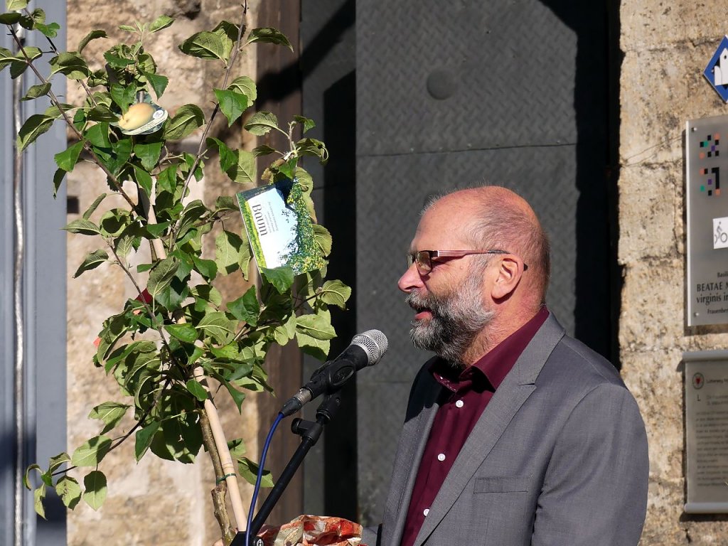 Ein Lächeln, das am Sonntag häufig zu sehen ist. Pastor Friedemann Heinrich von der Evangelischen-Freikirchlichen Gemeinde Nordhausen bringt gar einen Apfelbaum mit - Sorte "Schöner Nordhäuser". Genau das richtige Geschenk für den Pomologen Müller. Wann wohl der erste Kompott gekocht werden kann?