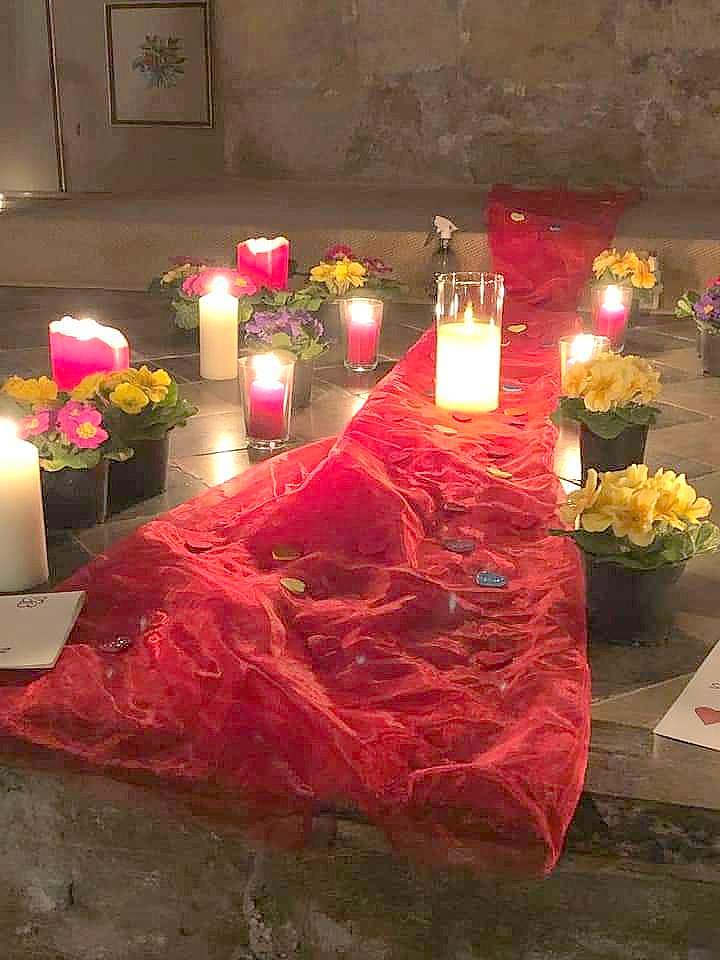 Im Hintergrund lief leise Instrumentalmusik von der Kanzel, Kerzenschein erhellte den Altarraum, Blumentöpfchen als Herzen drapiert sorgten für bunte Fröhlichkeit. Rechts und links des Altars wurde oftmals gleichzeitig gesegnet.