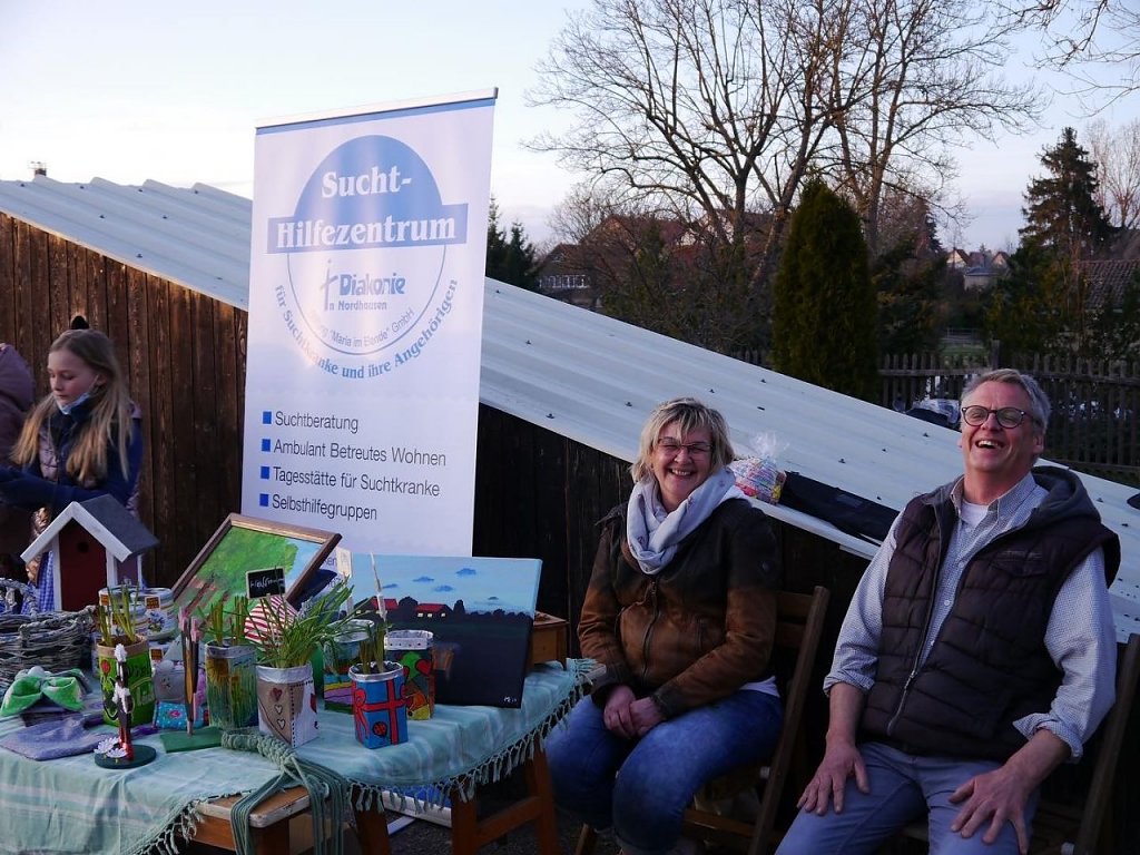 Nach dem Konzert geht es auf den großen Festplatz. Gemeindepädagoge Alexander Schönlein hat mit Jugendlichen Waffeln gebacken, Würstchen sind warm, Kaffee duftet. Eine Tombola verkauft Lose. Die Preise hatten folgende Firmen und Institutionen spontan gestiftet: Stadtparkapotheke René Richter, Buchhaus Rose, Werner Optik, Waffelwunder, Telekom Nordhausen, Evang.Militärseelsorge Sondershausen, Badehaus Nordhausen, Apotheke Wolkramshausen und Kreissparkasse Nordhausen. Die Werkstatt der Diakonie Suchthilfe hat einen Stand aufgebaut, ebenso ein paar Kinder aus Bleicherode, die selbstgebastelte Friedenstauben verkaufen für den guten Zweck.