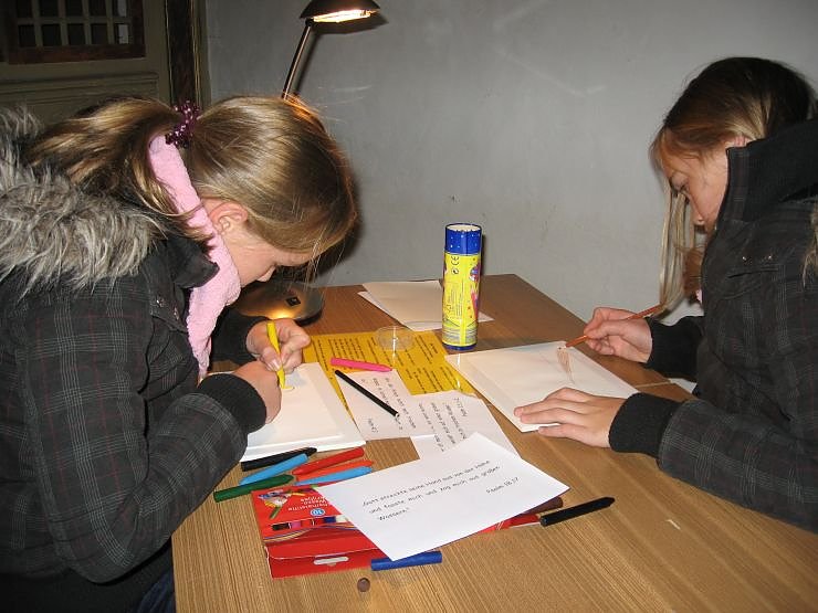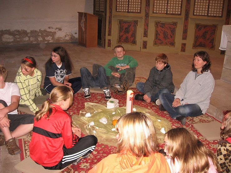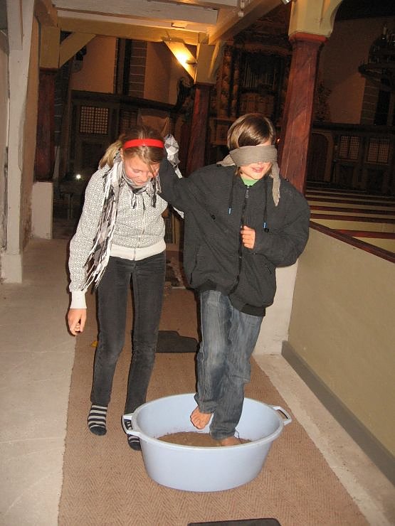 Kurz vor den Herbstferien trafen sich die Vorkonfimanden der Pfarrbereiche aus Ilfeld, Osterode, Sophienhof und Neustadt zur 1. Kirchenschlafnacht in der Neustädter St. Georg-Kirche. Nach einer guten Stärkung am Abend um 20.00 Uhr mit Würstchen, Brötchen und selbstgemachten, leckeren Dingen wie z.B. Wurst und Käse von der Ziegenalm Sophienhof oder Marmelade, war ein thematischer Einstieg in das Thema "Steine" im Pfarrhaus. Anschließend ging es in die Neustädter Kirche. Dort war ein kleiner Parcours vorbereitet worden, wo die Konfirmanden sich an verschiedenen Stationen wie .B. am Gedenkstein oder am Taufstein mit dem Thema auseinandersetzten. Danach wurde das Nachtlager vor dem Altar vorbereitet: mit Luftmatratzen, Decken , Kissen und Kuscheltieren wurde der Altarraum sehr gemütlich und alle waren ganz aufgeregt, wie das wohl werden würde, so einfach mal in der Kirche zu schlafen. Dann traf man sich noch zur Nachtwanderung "Rund um Neustadt". Um Mitternacht feierten alle zusammen mit den Organsiatoren Tina Bäske sowie Elke und Claus Conrad eine Taizé-Andacht am Taufstein. Spätestens um 3.00 Uhr wurde es langsam still in der Kirche . Am nächsten Morgen um 7.00 Uhr standen alle auf und schlurften bedächtig zum Frühstück in das Pfarrhaus. Nach dem leckeren Frühstück mit frischen Brötchen wurde noch gemeinsam abgewaschen und dann hieß es auch schon um 9.00 Uhr "Abschied" nehmen von der Neustädter Kirchenschlafnacht. Jedoch nicht, ohne das Erlebte in einer gemeinamen Schlussandacht festzuhalten und sich unter den Segen Gottes zu stellen. Zur Erinnerung erhielt jeder zum Mitnehmen einen besonderen Stein.