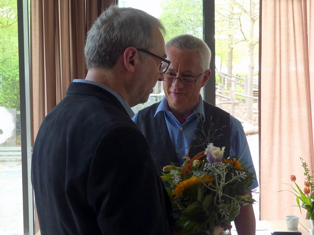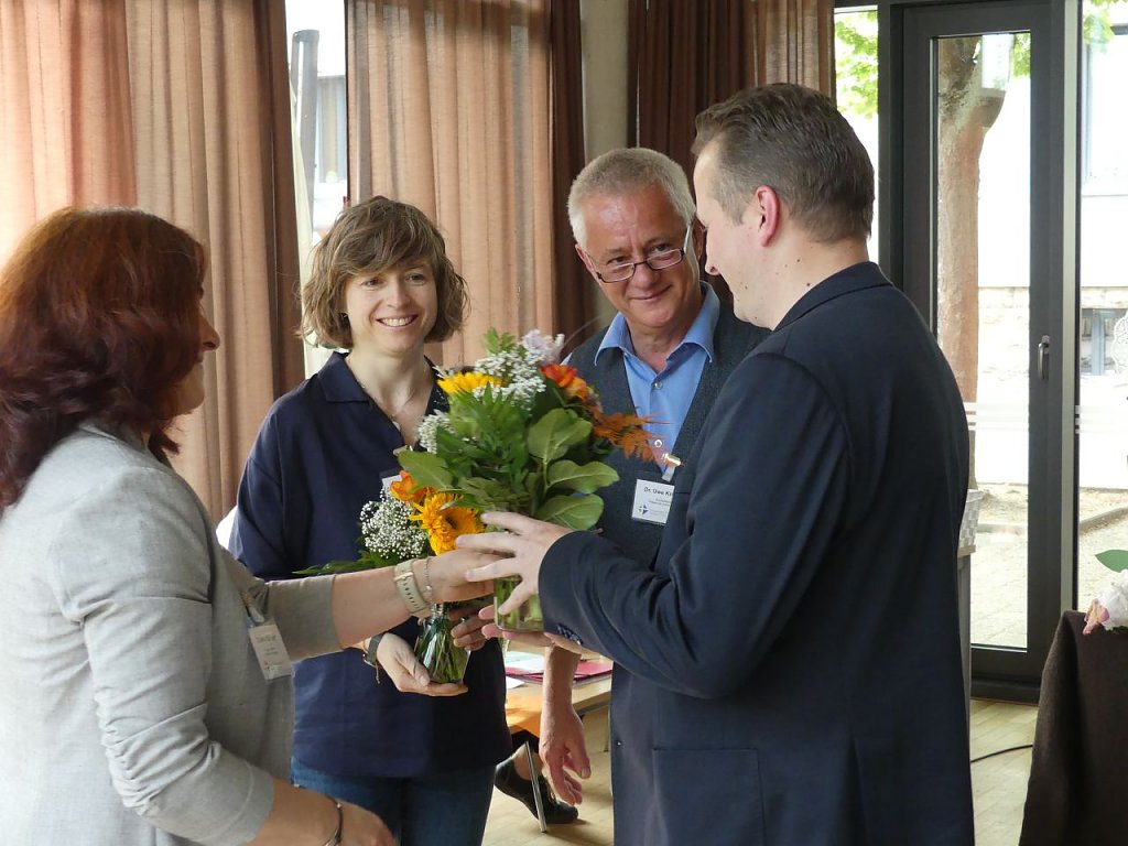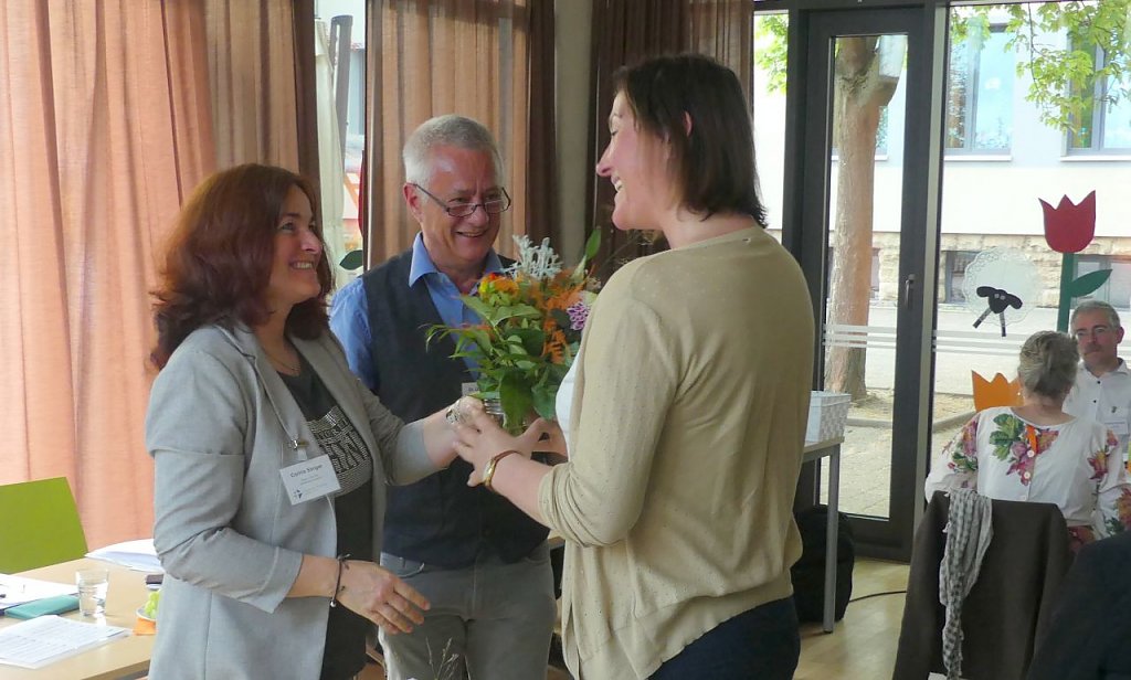 Ulrike Bauersfeld - Lysann Voigt-Huhnstock ist in Elternzeit - ist selbst gekommen, um uns die Schultüren zu öffnen, und wird auch gleich mit einem Blumenstrauß und guten Wünschen im Kirchenkreis willkommen geheißen.