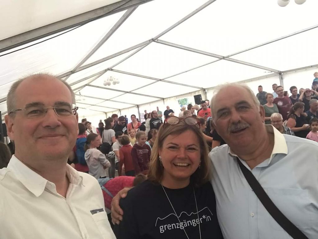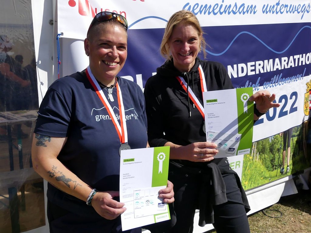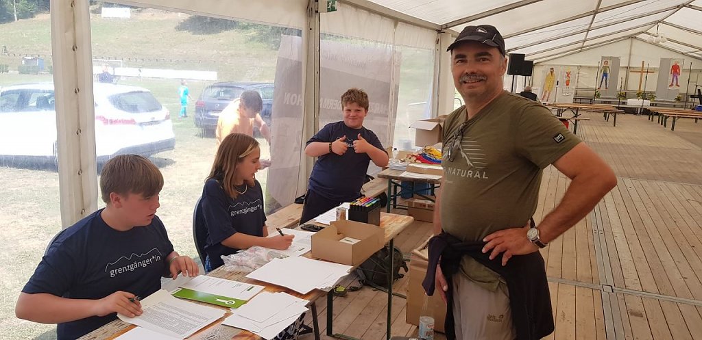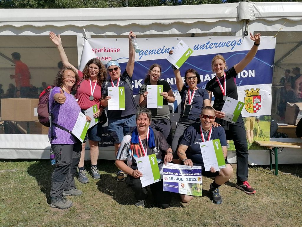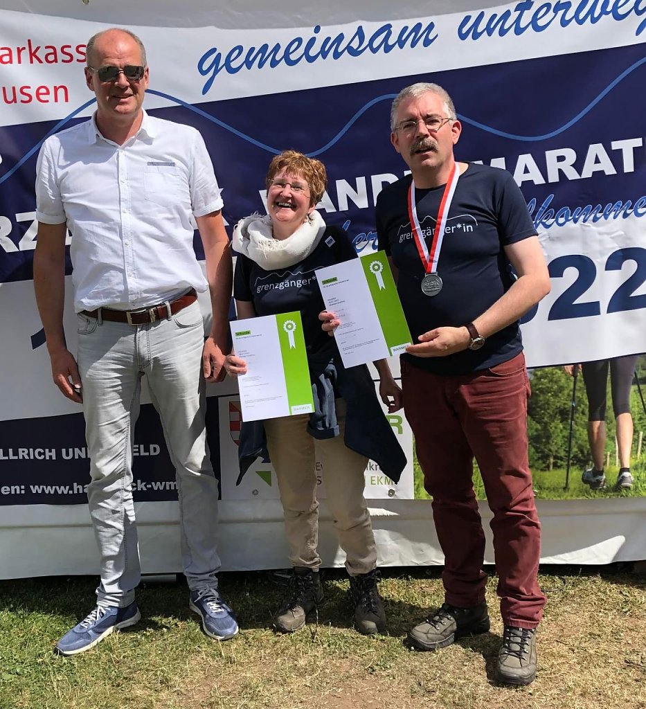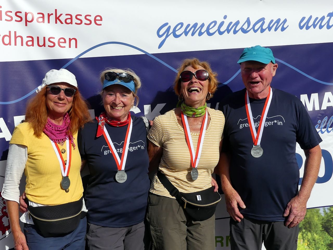 Die einen lachten schon schallend los, als sie sich an ihren Weg erinnerten, die anderen versuchten erst einmal ihre Muskeln wieder zu lockern, wieder andere konnten kaum glauben, dass sie den Weg doch so locker gemeistert hatten. Bis hin zu einer Dame, die mit ihren Freundinnen aus der Yoga-Gruppe an den Start gegangen ist. Mit 75 Jahren wanderte sie ihren ersten Marathon - immer wieder hat sich die Gruppe gegenseitig motiviert und getragen. Für sie alle war es ein wunderbares Erlebnis - gemeinsam sind sie über Grenzen gegangen - im wahren und übertragenen Sinne "Grenzgänger*innen. Das Glücksgefühl war unübersehbar und wird wohl noch eine Zeit vorhalten.
