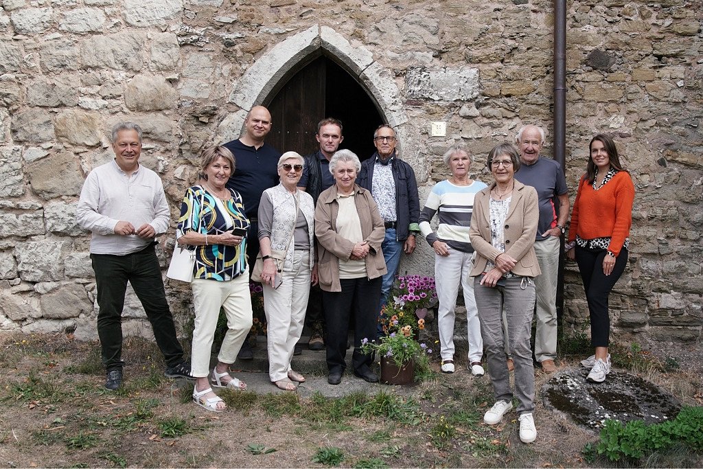 Pünktlich am 31. August 2022 um 11:00 Uhr wurde zur Eröffnung durch Herrn Bresgott vom Kulturbüro des Rates der EKD und zur Freude der versammelten Mitglieder der Kirchgemeinde und des Bürgermeisters der Stadt Ellrich, Herrn Pasenow das Projekt Alte Kirchen neu erwandern gewürdigt und die Plakette »Land:Gut 2022« vorgestellt. Anschließend wurde ganz in der Nähe der Frauenbergskirche ein Rotahorn in das durch Herrn August von der Firma Benjamin August – Pflanzenhandel und Gartengestaltung, der auch Mitglied des Gemeindekirchenrates ist, bereits vorbereitete Pflanzloch gepflanzt. Am Anhäufeln und Wässern beteiligten sich alle Anwesenden, auch als Zeichen der nun gemeinsamen Verantwortung für das Wachsen und Gedeihen dieses Baumes, der auch in Zeiten der Klimaveränderung gut gedeihen möge. Anschließend wurde neben der Eingangstür zur Kirche an geeigneter Stelle die Plakette angebracht. Obwohl nur vier Schrauben notwendig waren, wurden auch diese abwechselnd von den Anwesenden angezogen. Auch dies ein Zeichen der Verantwortung der Kirchgemeinde für das nun gemeinsam anzugehende Projekt. Verbunden mit der Auswahl des Projektes sind 8.000 EUR, die an die Kirchgemeinde zweckgebunden übergeben werden, wovon ein Teil gezielt für die Schaffung eines gemeinsamen Kirchenführers eingesetzt werden soll, der die sieben Kirchen des ‚Ellricher Kirchenwanderweges‘ und den Weg dahin beschreiben und erläutern soll. Ein weiterer Teil, nämlich ein Betrag von 5.000 EUR, ist für die Aufstellung von Insektenhotels vorgesehen, auch ein Beitrag zur Verhinderung des Rückgangs der Insektenpopulation im Südharz und im Raum Ellrich - eine schöne Symbolik, die sich in der goldenen Blüte der Plakette gewissermaßen ‚widerspiegelt‘.
