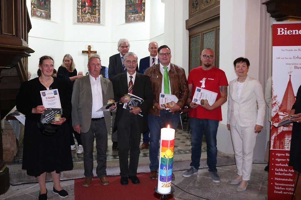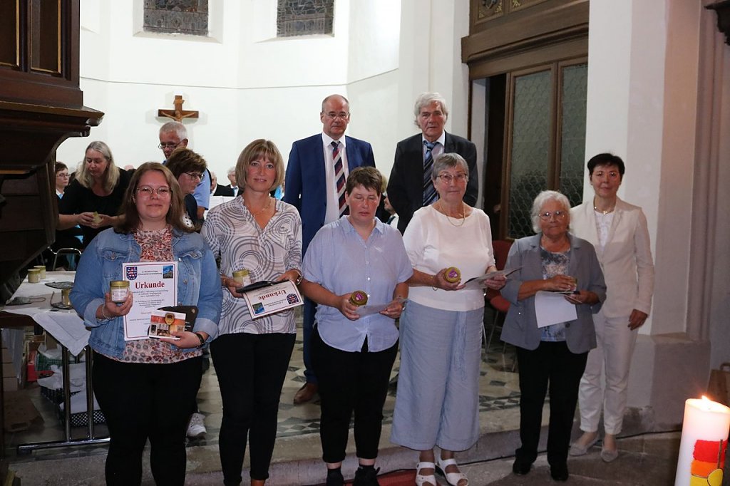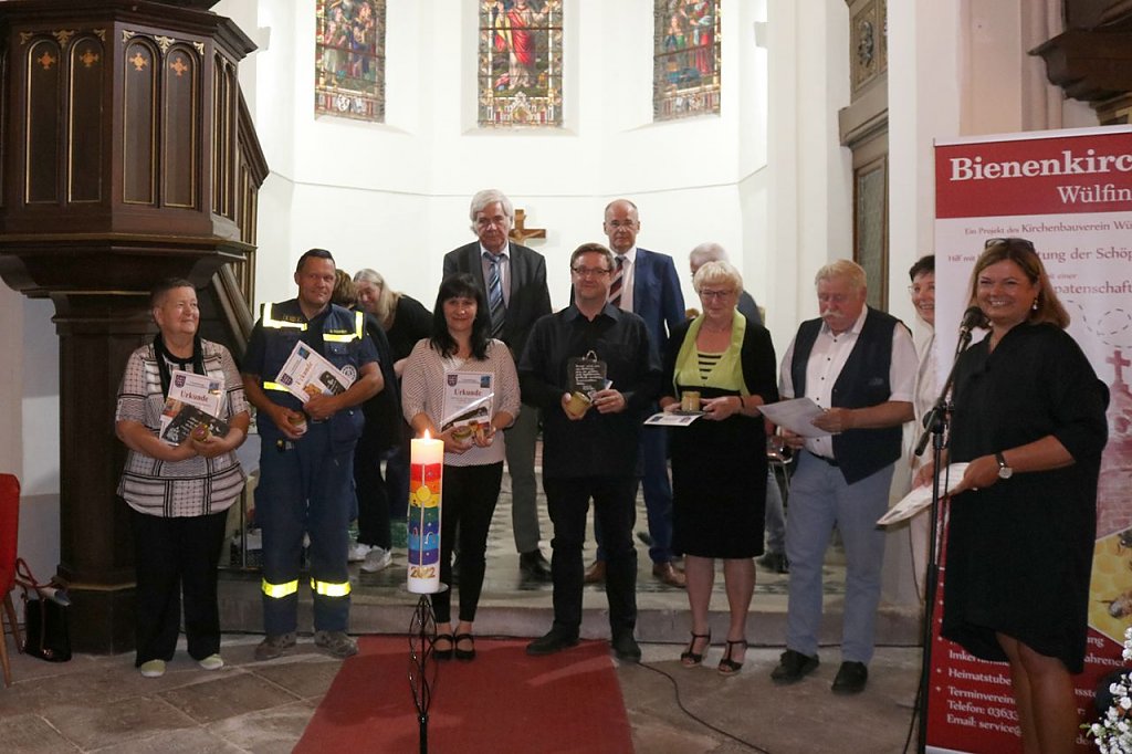 Es gab eine Urkunde, eine liebevoll handbeschriebene Schiefer (von der 1. großen Aktion des Kirchbauvereins 1998/99 - die Neueindeckung des Kirchturms!), ein Glas Honig von der Bienenkirche Wülfingerode, eine Postkarte der Kirche und eine Einladung zum Tag des offenen Denkmals. Damit alles unbeschadet nach Hause getragen werden konnte, gab es von Dagmar Becker noch eine Papiertüte mit Bienchen dazu.