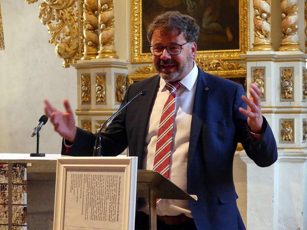 Kirchbaureferentin Brunhilde Stolze erklärte noch einmal, was alles zusammengespielt hat, damit dieses Fenster in seiner Einzigartigkeit in St. Marien erstrahlen kann. Vom Wettbewerb über die IBA bis zu verschiedensten Förderungen.