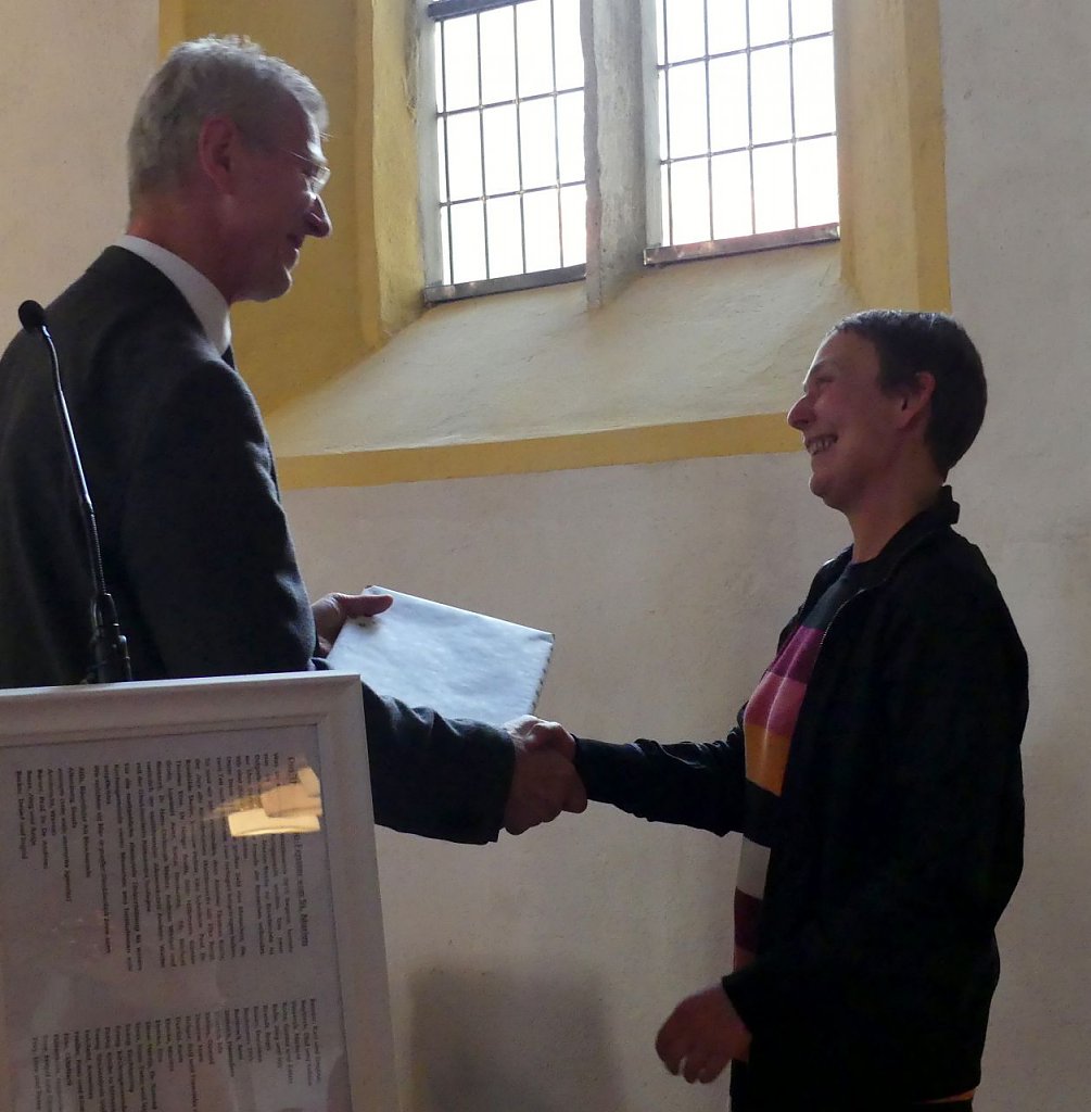 Nach dem Festgottesdienst mit viel Musik - Kirchenchor und Flötenkreis unter der Leitung von Margarita Yeromina - gab es zahlreiche ehrende Worte und eine besondere Auszeichnung für Dr. Christoph Maletz. Er erhielt das Thüringer Ehrenamts-Zertifikat, stellvertretend überreicht durch Stephan Domann, dem Vorsitzenden des Bau- und Finanzausschusses.
