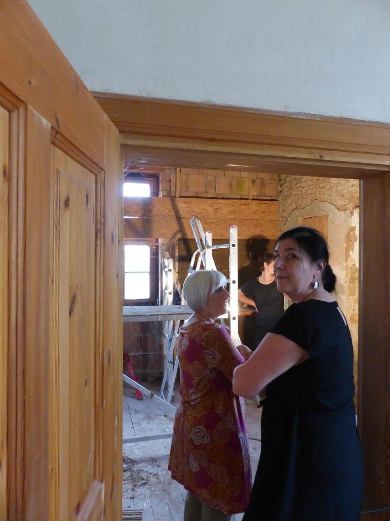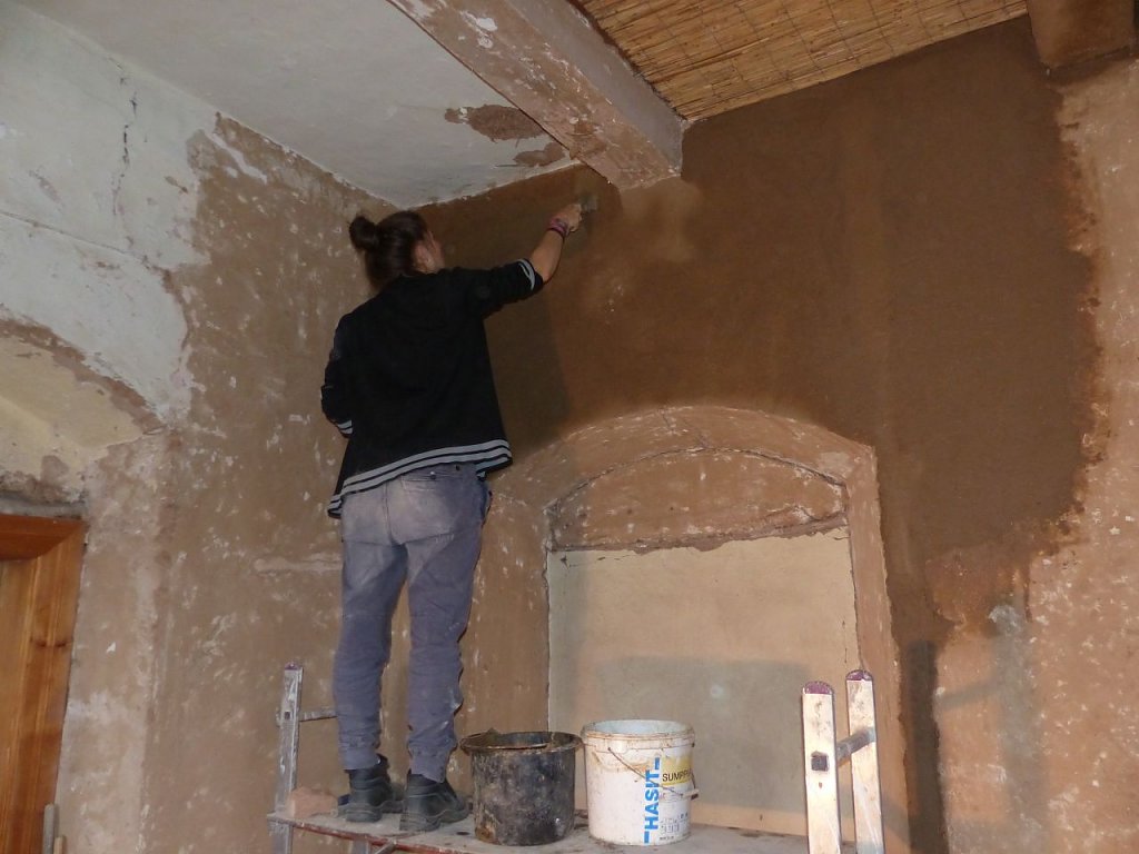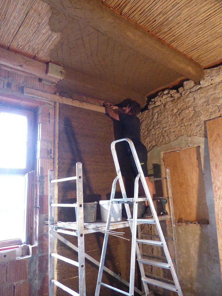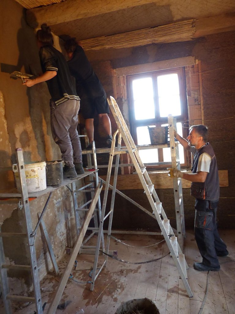 Es kam dann manches anders als vorerst geplant, war aber ein voller Erfolg. Die zuerst angekommene Teilnehmerin zeigte ihre Begeisterung für ein ökologisch nachhaltiges Leben, indem sie mit dem Fahrrad direkt von Leipzig anreiste. Auch Carolin aus Marburg hatte ihr Fahrrad dabei. Dass man mit einer gut vorbereiteten Lehmbaustelle genügend Wissens-Input für eine Woche liefern kann, überraschte den Kursleiter, der eigentlich noch mehr Themen beackern wollte. Dadurch kam es aber zu einem ordentlichen Baufortschritt im 2. Pilgerzimmer, der jetzt aber erstmal durchtrocknen muss. Die Nachbarn bemerkten, dass bis in die Abendstunden LIcht auf der Baustelle war und kamen sowohl zum Schauen als auch zum Helfen vorbei (herzlichen Dank für die Tomatenkomplettversorgung), aus den Reihen des Vereins wurde das Mittagessen organisiert und auch etwas Kuchen.