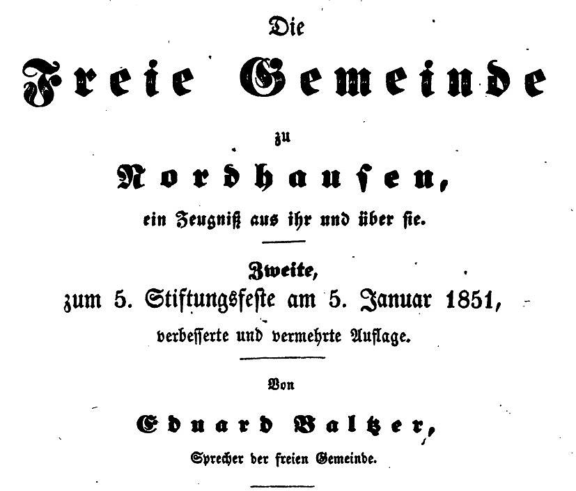 In Nordhausen finden wir mit Eduard Baltzer (1814-1887) einen führenden Vertreter dieser Bewegung. Pfarrer Baltzer gilt als »Erfinder« der Jugendweihe (1852) und wurde zum ersten Präsidenten des Bundes Freireligiöser Gemeinden in Deutschland gewählt. Eine große Freireligiöse Gemeinde hat es auch in Nordhausen gegeben (nach Baltzer 1851: ca. 2000 Mitglieder!).