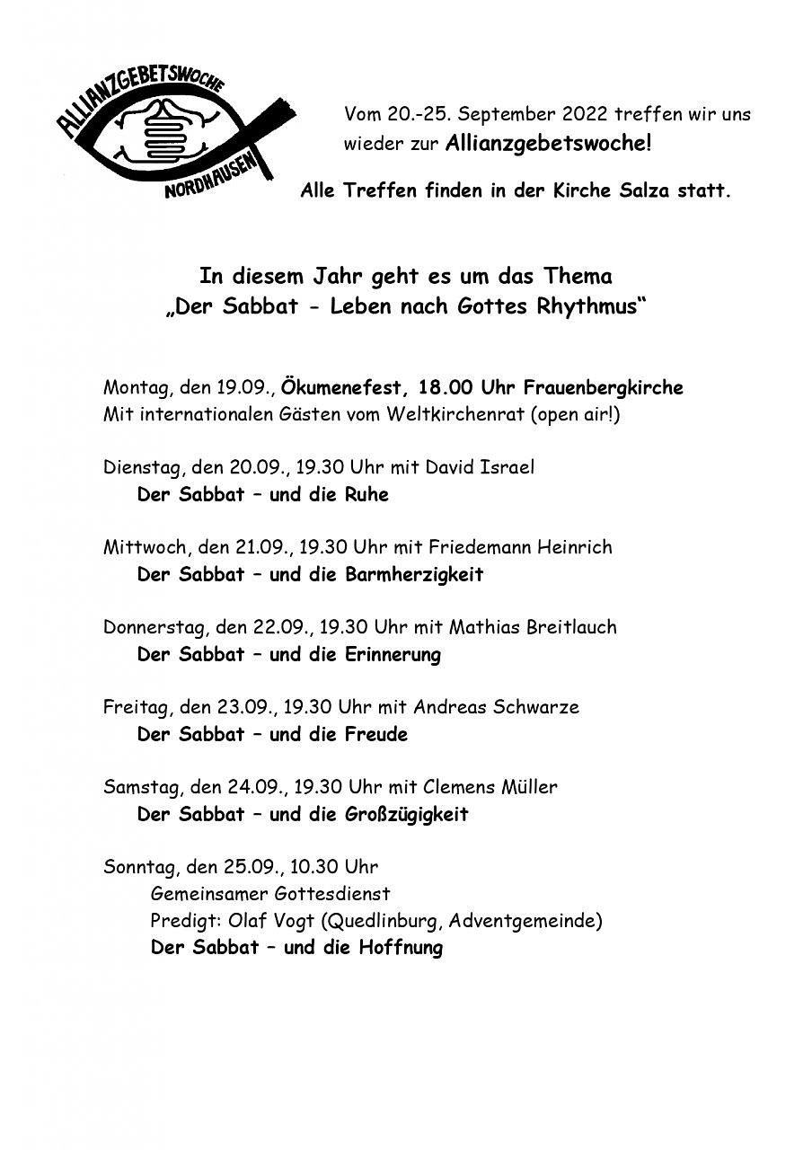 Start ist das Ökumenefest in der Frauenberggemeinde mit Gästen der 11. Vollversammlung des Ökumenischen Rates am 19. September. Hier finden Sie die verschiedenen Themen der Veranstaltungen, die an den folgenden Abenden in der Kirche Nordhausen Salza stattfinden.