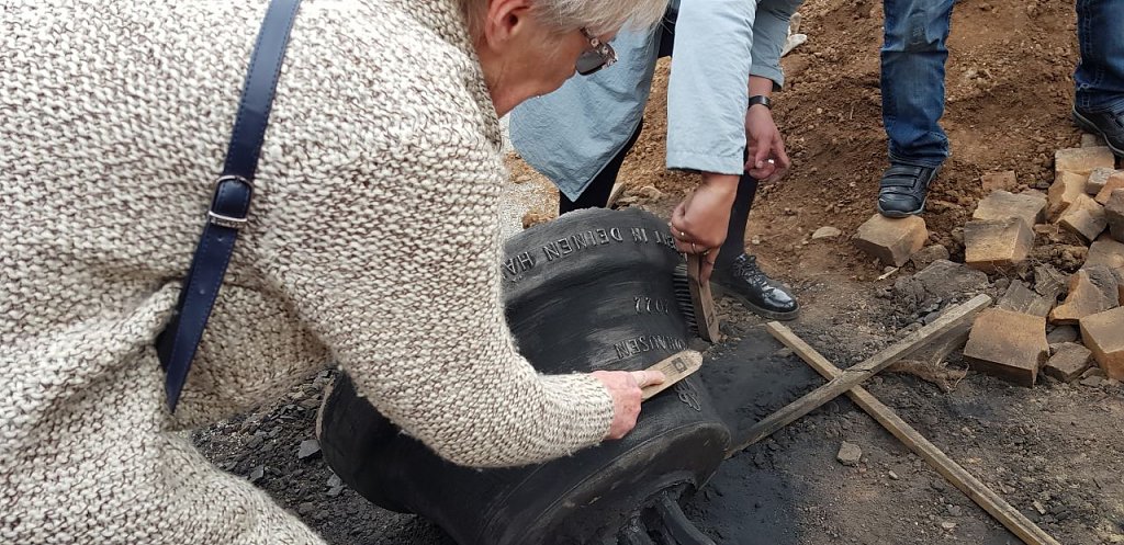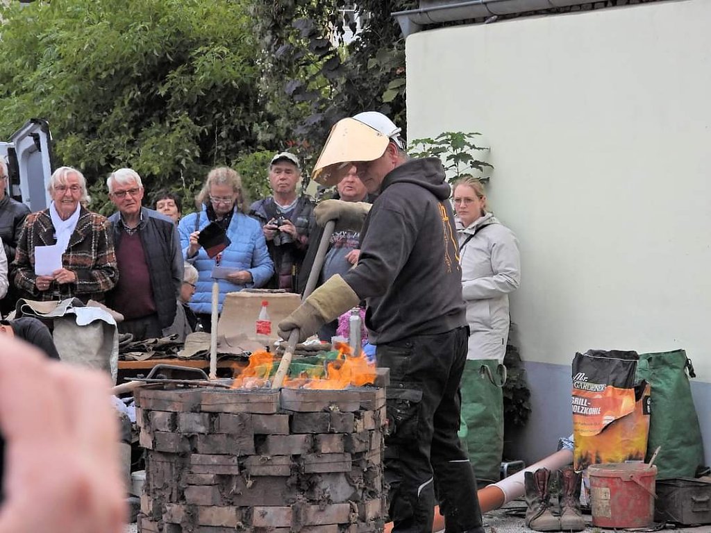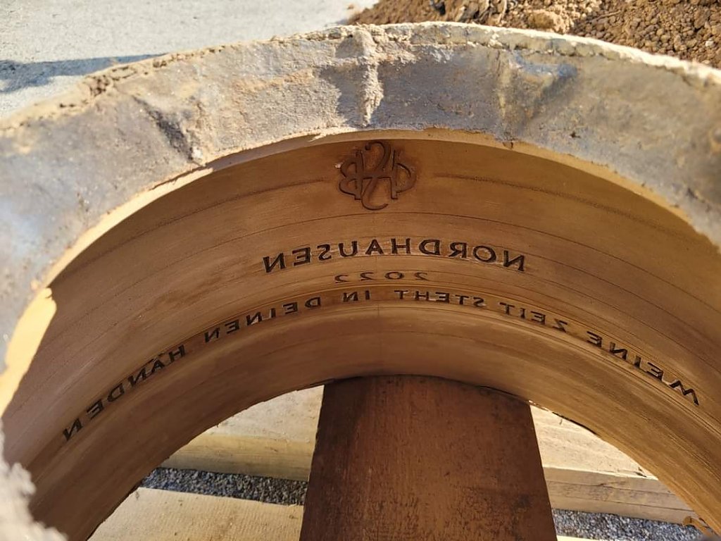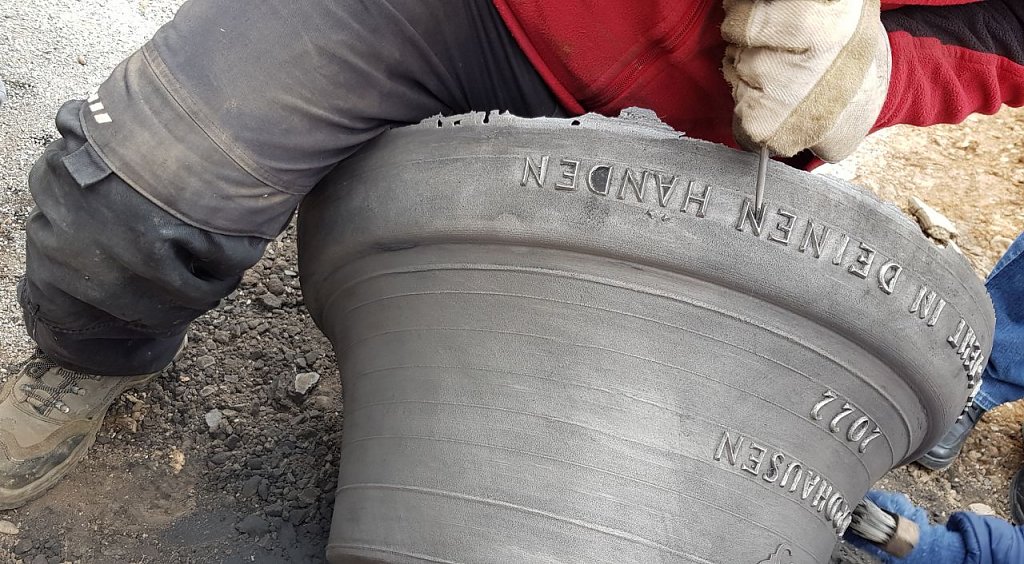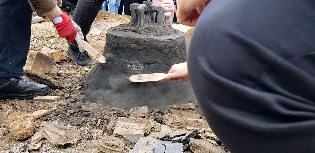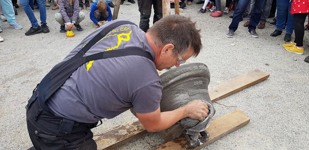 (re) Als am 24. September das Abendläuten der Blasiikirche in Nordhausen zu hören war, trat der Glockengießer Christoph Schmitt aus Brockscheid in Aktion. Ganz in der Nähe der Kirche hat er unter den gespannten Blicken des Publikums, mitten in der Stadt, eine Glocke gegossen. Sie wird mit ihren 150 kg (133 kg waren es nach dem Guss tatsächlich) und 66 Zentimetern Durchmesser die neue bronzene Uhrschlagglocke. Der Guss ist gelungen, kurz nach der Reinigung hörte man bereits am Sonntagnachmittag beim Gemeindefest einen ersten Ton. Viele, viele Hände, alte und junge waren hier gemeinschaftlich im Einsatz. Nordhausen hat bei seiner neuen Glocke wahrlich selbst Hand angelegt und wurde mit reichlich schwarzem Schmutz beim Bürsten belohnt. Das tat dem Elan jedoch in keiner Weise Abbruch.
