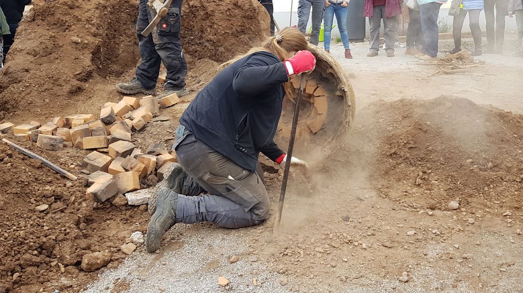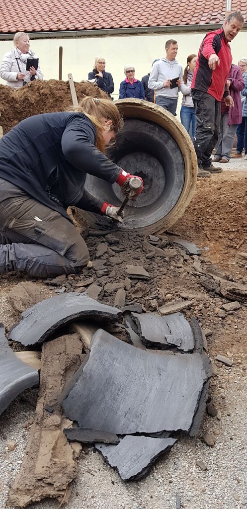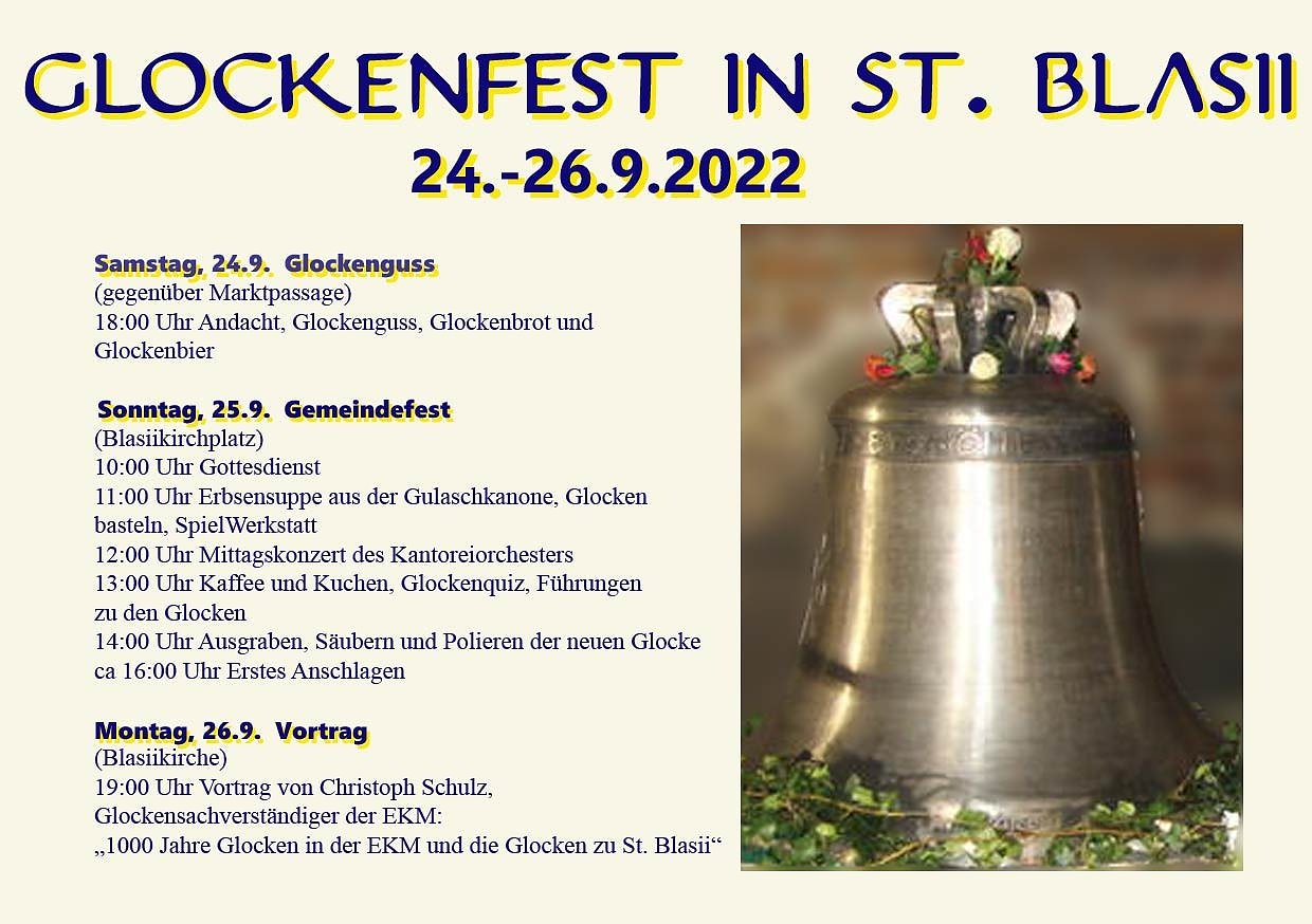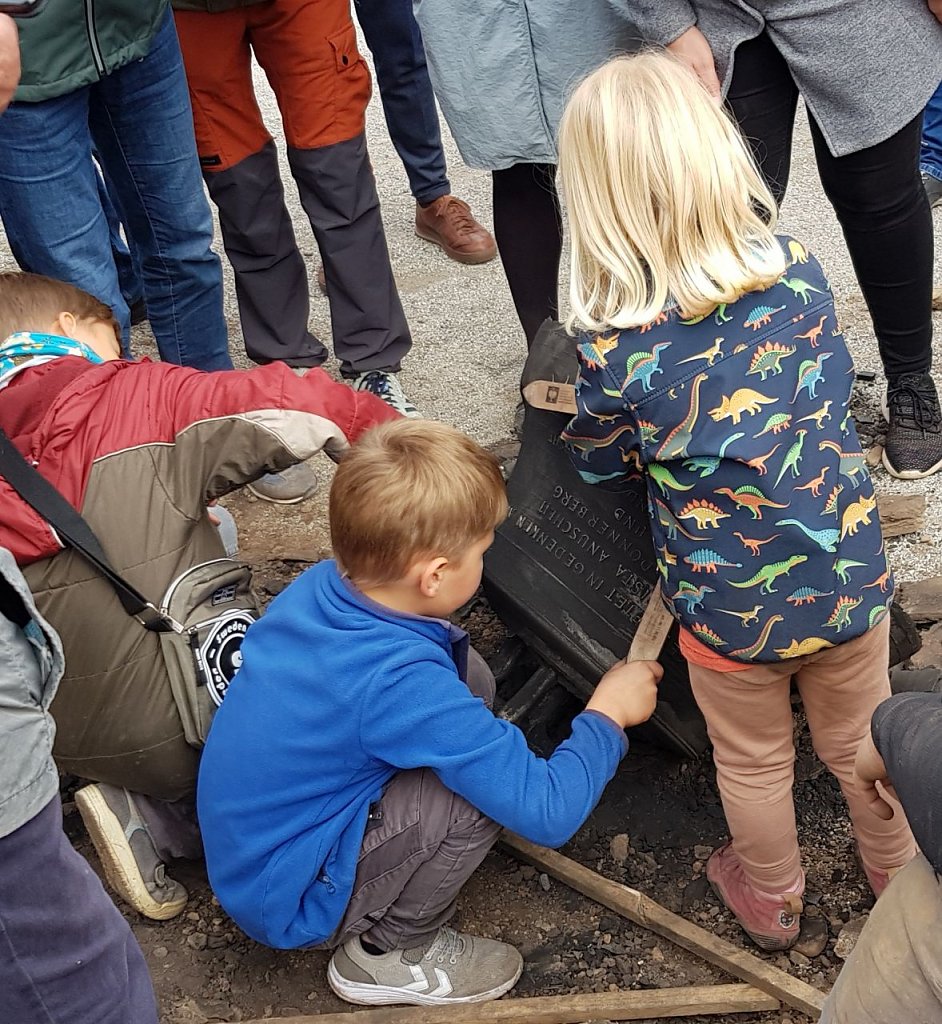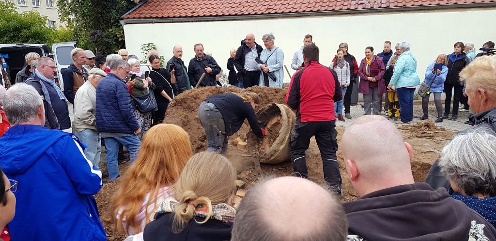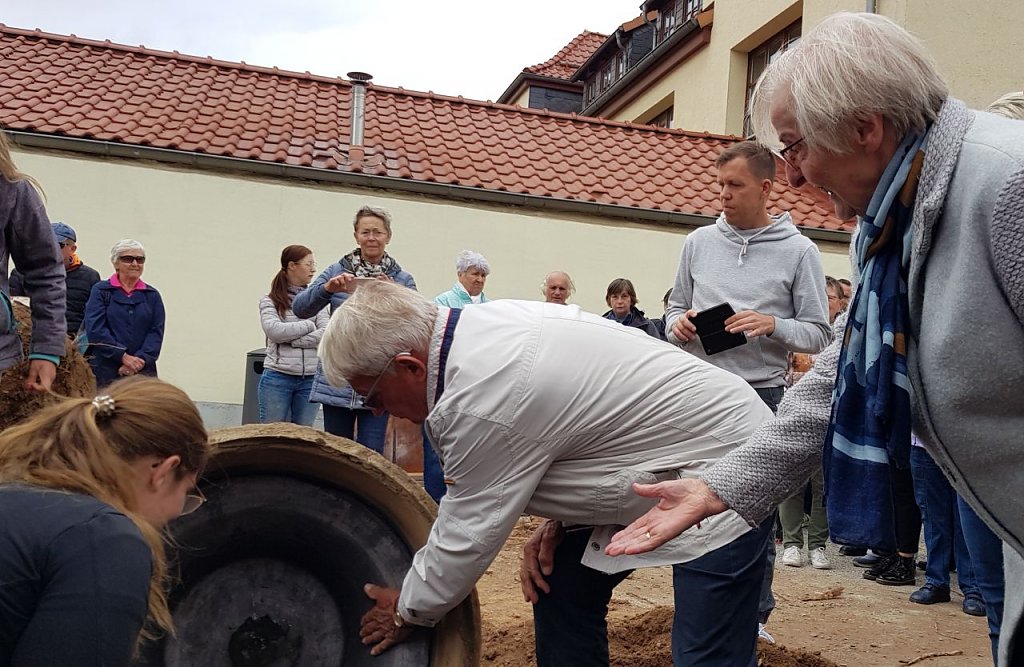 (re) Als am 24. September das Abendläuten der Blasiikirche in Nordhausen zu hören war, trat der Glockengießer Christoph Schmitt aus Brockscheid in Aktion. Ganz in der Nähe der Kirche hat er unter den gespannten Blicken des Publikums, mitten in der Stadt, eine Glocke gegossen. Sie wird mit ihren 150 kg (133 kg waren es nach dem Guss tatsächlich) und 66 Zentimetern Durchmesser die neue bronzene Uhrschlagglocke. Der Guss ist gelungen, kurz nach der Reinigung hörte man bereits am Sonntagnachmittag beim Gemeindefest einen ersten Ton. Viele, viele Hände, alte und junge waren hier gemeinschaftlich im Einsatz. Nordhausen hat bei seiner neuen Glocke wahrlich selbst Hand angelegt und wurde mit reichlich schwarzem Schmutz beim Bürsten belohnt. Das tat dem Elan jedoch in keiner Weise Abbruch.