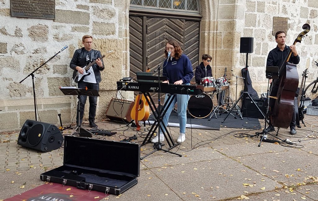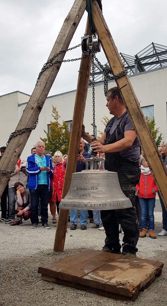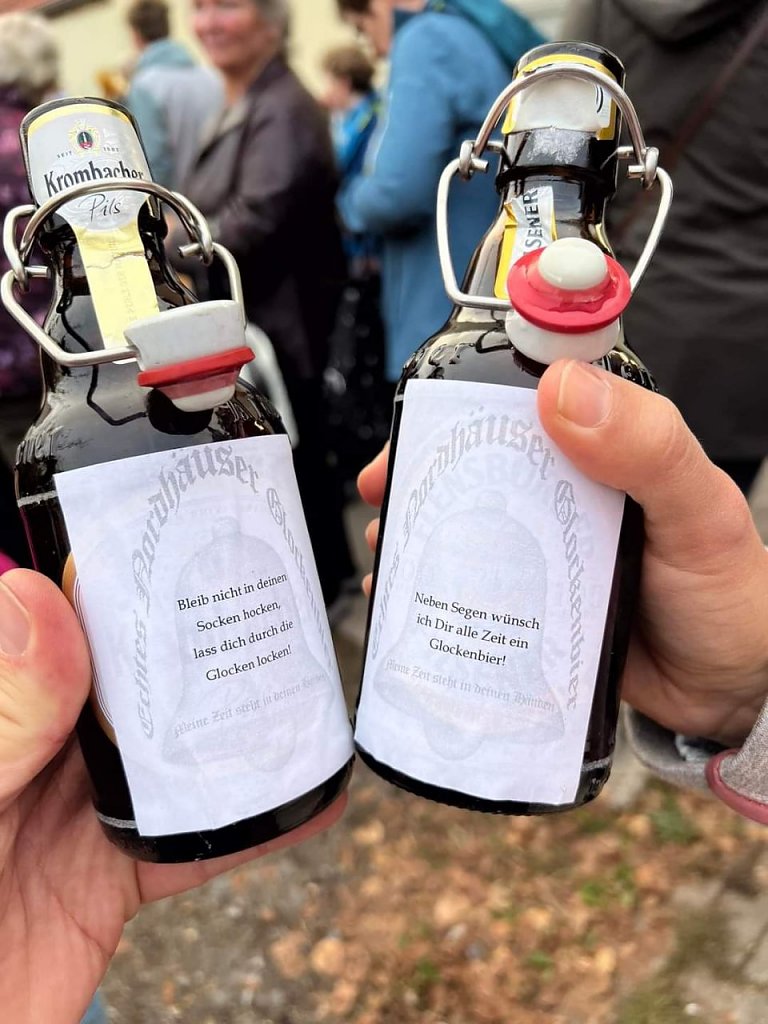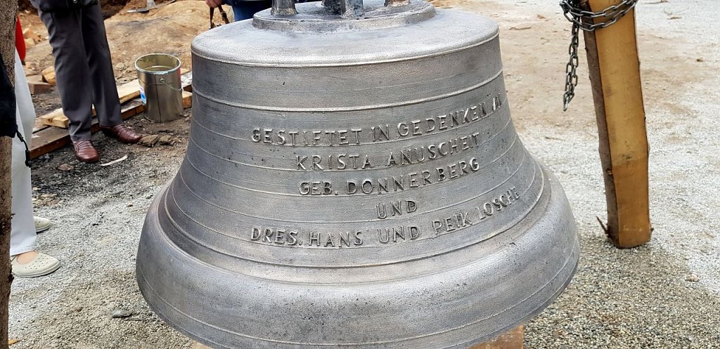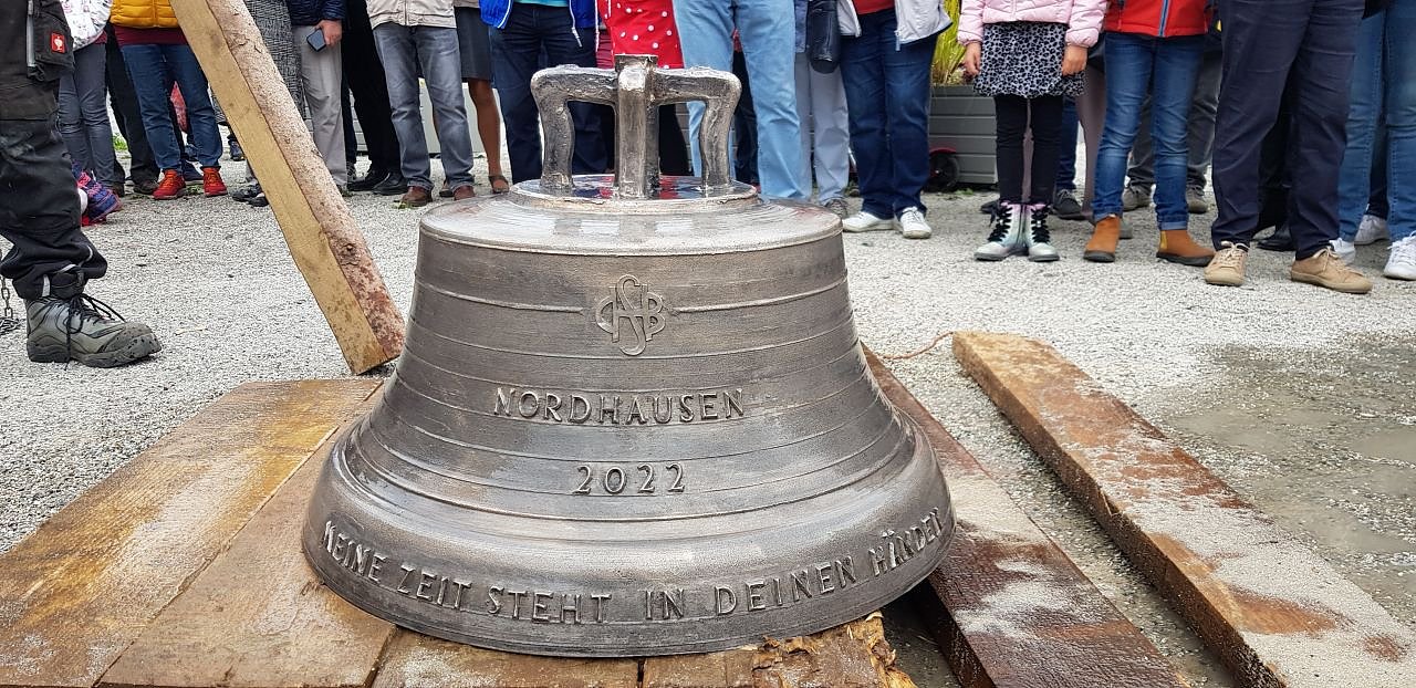 Glockenweihe wird nach der Aufhängung im Turm dann am Reformationstag gefeiert. Was nach einem einmaligen Erlebnis für die Zuschauer klingt, ist für die Spender der notwendigen 18.000 Euro, das Ehepaar Ute und Klaus Drechsler sowie Barbara Losche, viel mehr. An den beiden Tagen waren sie ständig präsent und haben jeden Handgriff mit eigenen Augen mitverfolgt. Die Rührung, als das gute Stück dann endlich sichtbar wurde, war unbeschreiblich. Alle Drei verspüren eine tiefe Freude, denn es ist ihnen gelungen, eine bleibende Erinnerung zu schaffen. Eine Erinnerung mit diesem Gusserlebnis für ganz Nordhausen und mit der Glocke an geliebte Menschen, von denen sie jeweils Abschied nehmen mussten – Zwillingsschwester sowie Mann und Sohn. Wer diesen Hintergrund kennt, wird die Inschrift der neuen Glocke Meine Zeit steht in deinen Händen! noch einmal ganz anders betrachten. Und ihr vielleicht auch anders lauschen, wenn sie künftig alle Viertelstunde erklingt. Die Glocke erinnert uns daran, dass all unsere Zeit, Gutes und Schweres, in Gottes Hand steht, bekräftigt Pfarrerin Elisabeth Alpers-von Biela mit Blick auf die Lebensgeschichten der Drei.