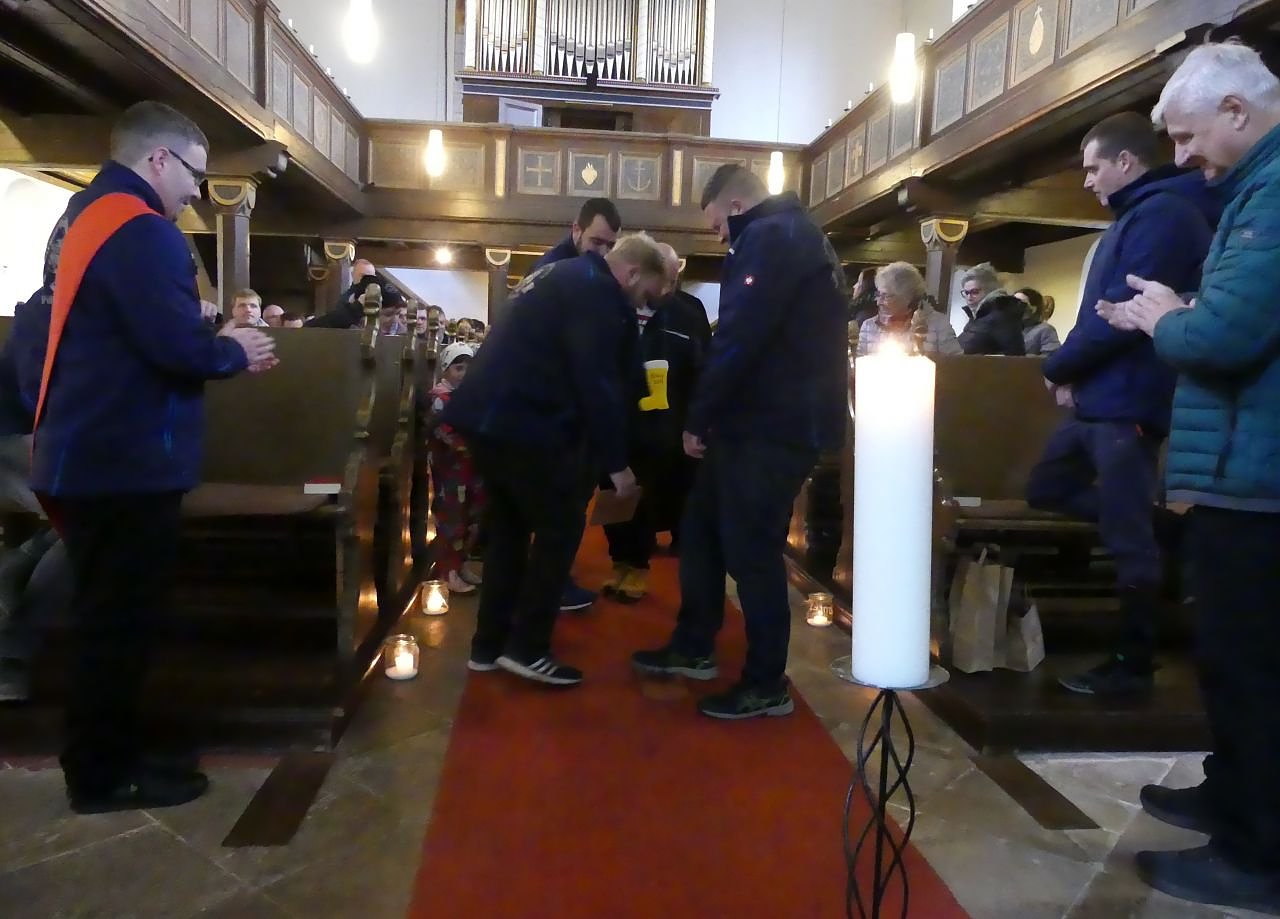Als sich am Montagmittag nach dem Kirmeswochenende die Kirche in Wülfingerode langsam füllt, ist es Zeit für einen besonderen Gottesdienst – 165 Jahre Kirchweih. Im November 1857 wurde die Kirche geweiht, seither feiert man in diesem Monat Kirchweih oder Kirmes. Tradition wird geschätzt in Zeinsbockrode. Die Kirmesburschen und ihre Familien sitzen in den Kirchenbänken. Nicht jedem fällt das leicht, wurde doch am Sonntag noch ausgiebig gefeiert. Beim Einzug in die Kirche geht der neue Kirmesschulze Felix Aßmann mit der Kerze vorneweg. Seit Samstag ist er im Dienst. Seine Aufgabe wird das Ausrichten der Kirmes 2023/24 sein. Hinter ihm der alte Schulze Robin Hinneburg mit der Fahne der Kirmesburschen, gefolgt von Pfarrer Thomas Eichfeld und Stephan Domann vom Gemeindekirchenrat. Die Kirmesburschen haben eine enge Verbindung zu St. Elisabeth. Dort haben sie ein eigenes Kirmesburschenzimmer auf der Empore, das historische Fotos und Gegenstände zeigt.