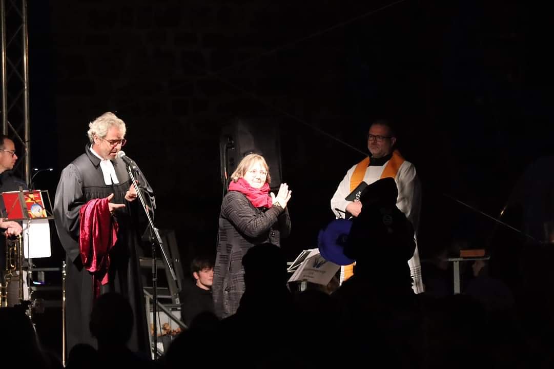 Martini in Nordhausen - ein riesiges Fest in ökumenischer Gemeinschaft. Auf den Fotos sieht man Pfarrer Klemens Müller und Pfarrer Steffen Riechelmann. Sie gestalteten vor der Blasiikirche mit vielen anderen Beteiligten die Andacht. An ihrer Seite in diesem Jahr Cornelia Georg - erstmals als unsere neue Gehörlosenseelsorgerin - als Dolmetscherin für Gebärdensprache im Einsatz.