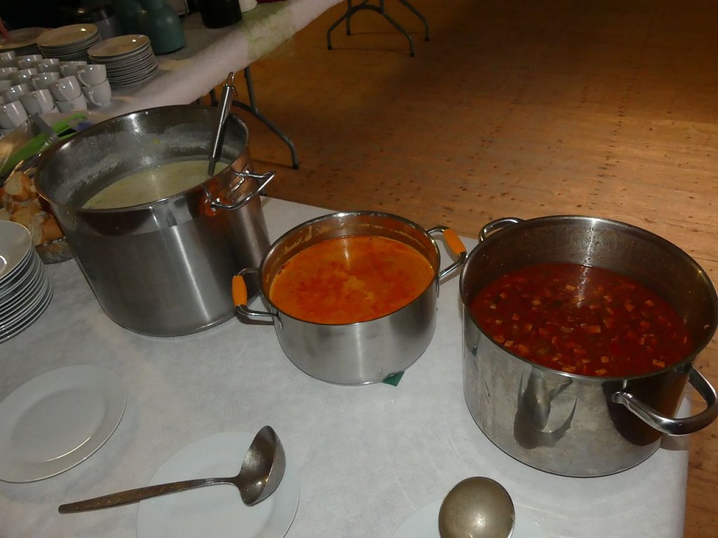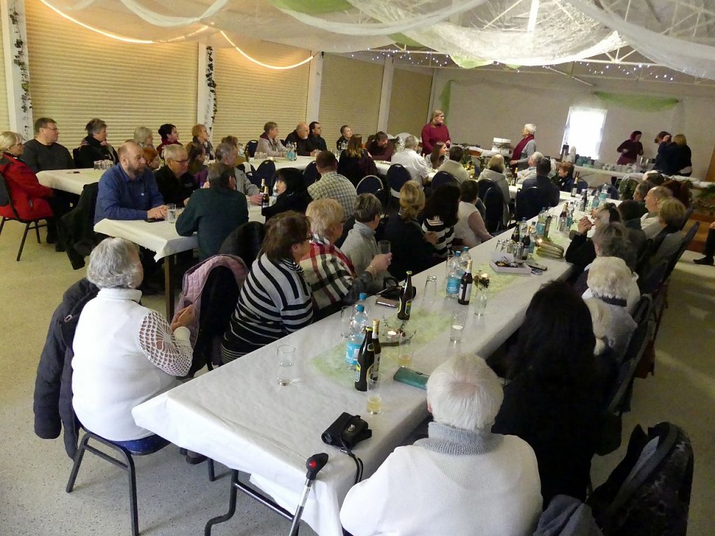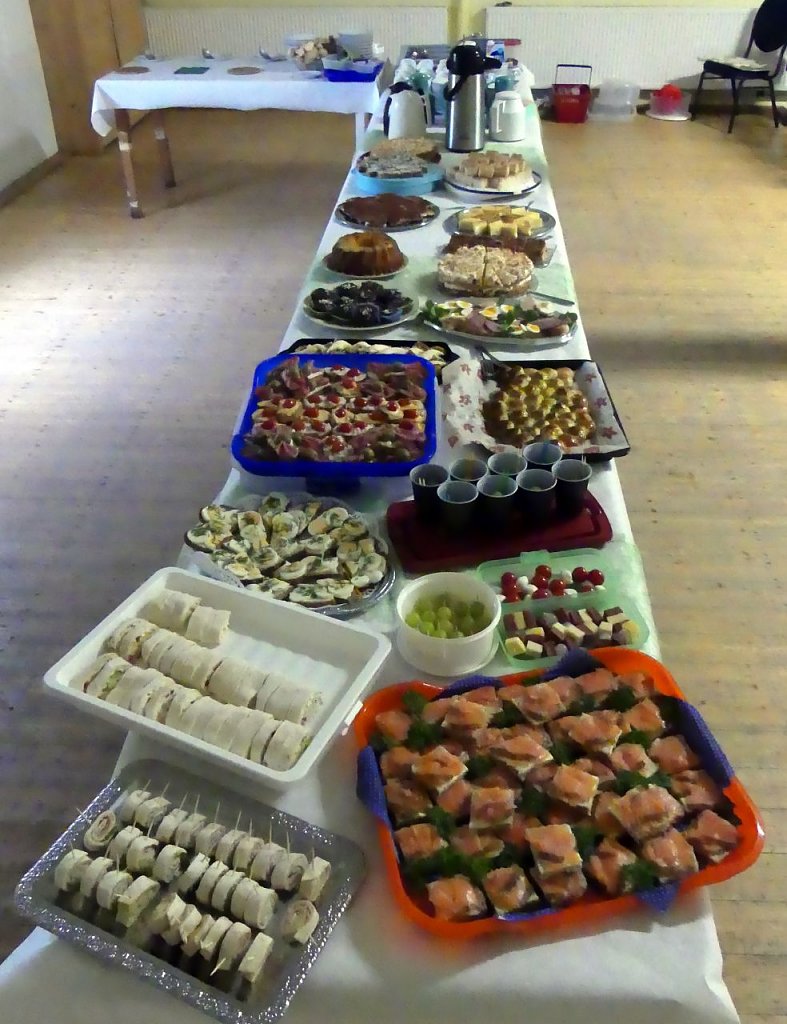 Nach dem Segen für die Pfarrerin und dem gemeinsamen Abendmahl geht es in den Festsaal von Nohra. Die bereitgestellten Tische und Stühle reichen nicht, es muss nachgelegt werden, so viele sind mitgekommen. Um die Versorgung muss man sich dennoch keine Sorgen machen, die Tische biegen sich vor Köstlichkeiten.