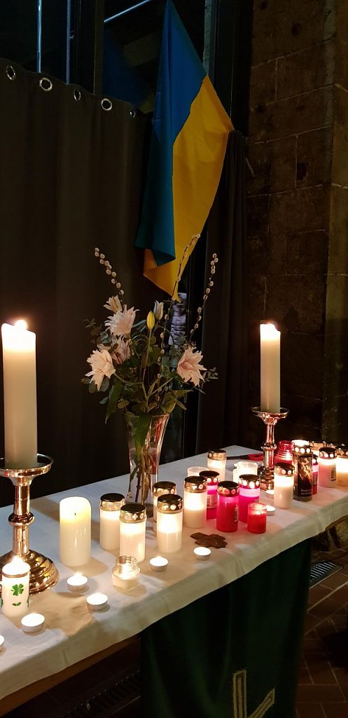 Die Frauenbergkirche hatte sich im Lauf des Abends immer mehr gefüllt. Die Stühle reichten längst nicht. Viele ukrainische Familien sind mit ihren Kindern gekommen. Kleine schliefen auf den Armen ihrer Mütter. Nach dem Friedensgebet gingen einige mit dem Gebet im Herzen in die Stille des Abends. Andere kamen dann erst in die Kirche, um bei ihrer ukrainischen Gemeinde zu sein, sie hatten das Gebet nicht stören wollen, hatten vorher Kerzen vor der Kirche entzündet.