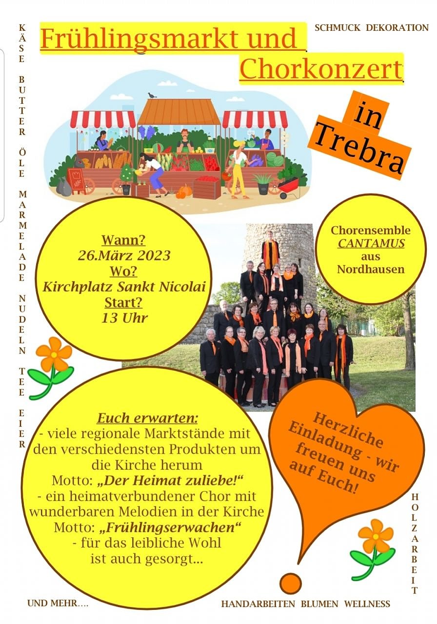 Diesen Sonntag, 26. März, ab 13 Uhr feiern sie unter dem Motto Der Heimat zuliebe ihren ersten Frühlingsmarkt mit Chorkonzert rund um die Kirche St. Nicolai. Regionale Marktstände mit viel Handgemachtem laden ein, entdeckt zu werden. Käse, Butter, Öle, Marmelade, Nudeln, Tee, Handarbeiten, Blumen, Holzarbeiten, Schmuck, Dekoration und Wellness-Artikel sind im Angebot. Auch für das leibliche Wohl wird bestens gesorgt sein, erzählt Stefan Mund vom Organisationsteam. Zum allgemeinen Wohlbefinden lässt der Nordhäuser Chorensemble Cantamus seine Stimmen erklingen. Unter dem Titel Frühlingserwachen wird er in der Kirche zu hören sein. Und das soll nicht der letzte Markt dieser Art sein, berichtet Mund weiter. Der Staffelstab wird noch am Sonntag an die nächste Gemeinde weitergereicht. Man darf also gespannt sein. Vertreten sind übrigens an diesem Tag die Pfarrbereiche Silkerode, Großbodungen, Bleicherode, Nordhausen, Ilfeld und natürlich die Gemeinden des Pfarrbereichs Trebra. Wie man auf die Idee kam? Es stehen Strukturveränderungen in unseren Kirchenkreisen an. Seinen Nachbarn besser kennenzulernen, ist da schon einmal ein guter und wichtiger Anfang, erklärt Stefan Mund den Auslöser für diesen fröhlichen Markt. Darum wollen die Initiatoren auch gar nicht so gern in Pfarrbereiche unterteilen – Pfarrbereich Heimat, das ist die Lösung, die die Trebraer anbieten. Herzlich laden sie ein, sich kennenzulernen und es sich ganz nebenbei am Sonntag in Trebra gutgehen zu lassen.