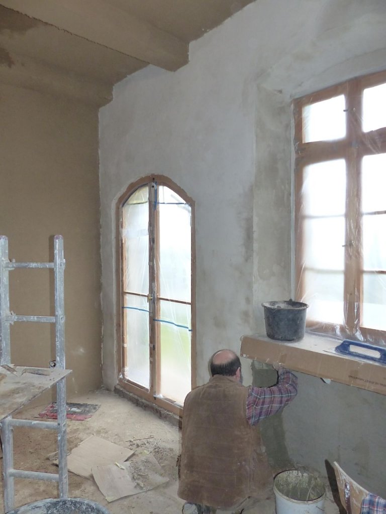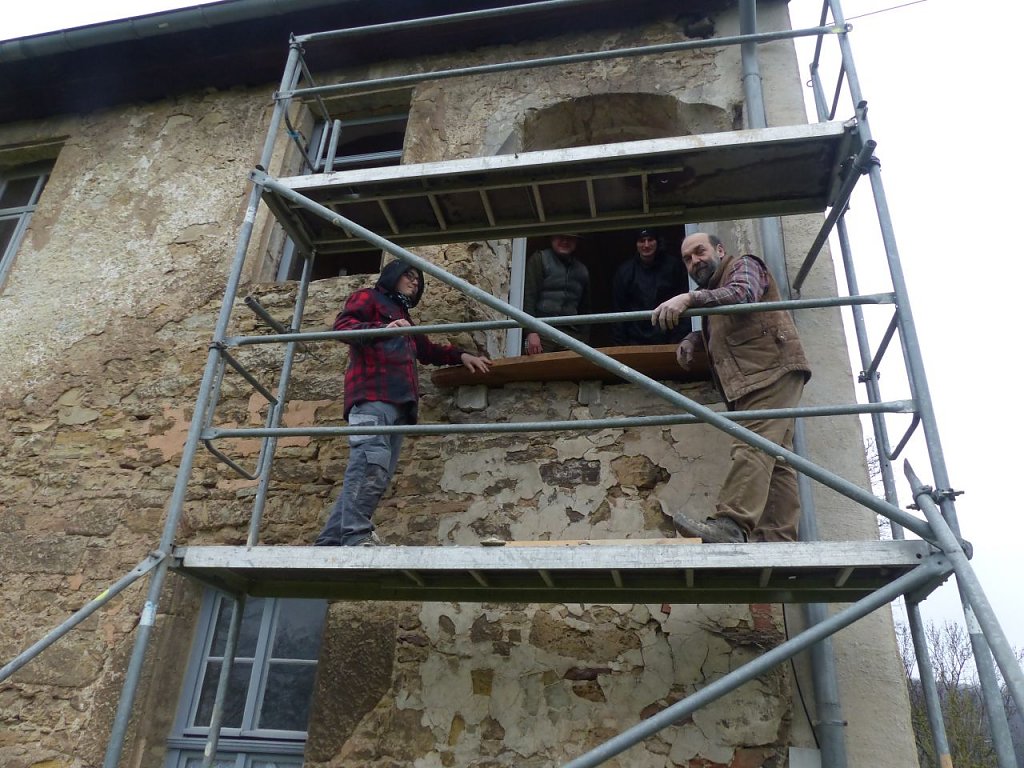Im Zimmer 121 wurden die Fensterbänke eingesetzt, die letzten Lehmputzlücken und -risse geschlossen und auch der schwere Eichentritt zum "Brockenblick" eingesetzt. Zwei Leute in der Türöffnung und zwei auf dem Gerüst, mehr Platz war nicht, und mit weniger Menschen wär es auch nicht zu schaffen gewesen. Ein Geländer wird vor dem Abbau des Gerüstes provisorisch angebracht, bei der nächsten "Sommerbauschule" wird es einen Schmiedekurs geben, bei dem das endgültige Geländer gefertigt wird.