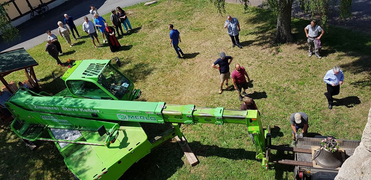 Ergriffenheit machte sich breit und alle, die gern wollten, durften die Glocke selbst anschlagen. Dann griff das große Gefährt zu und hob die Pilger-Glocke in den Turm. Oben wartete bereits Rigo Rudel und ein weiterer Mitarbeiter der Firma Beck. Mit viel Ruhe und großer Konzentration lenkten sie die "Kleine" durch die Schallluke in den Turm.
