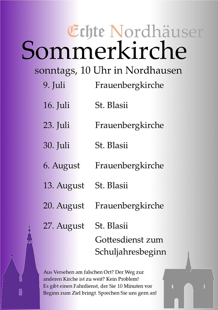 Sonntagmorgen im Sommer. Die Stadt erwacht. Die Glocken läuten. Aber etwas ist anders in diesem Sommer 2023. Denn die Nordhäuser Innenstadtgemeinden feiern im Juli und August GEMEINSAME Gottesdienste, jeweils in St. Blasii ODER in der Kirche am Frauenberg. Auch die Pfarrer machen sich auf den Weg und predigen von den jeweils anderen Kanzeln. Den Abschluss bildet der Gottesdienst zum Schuljahresstart am 27. August.
