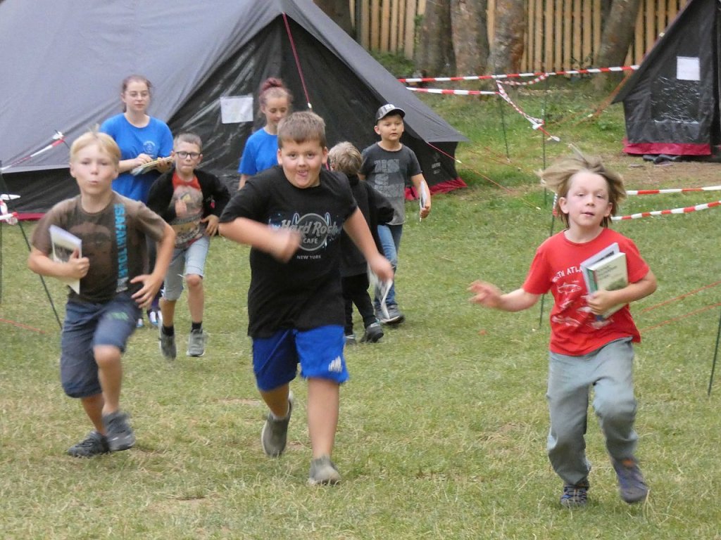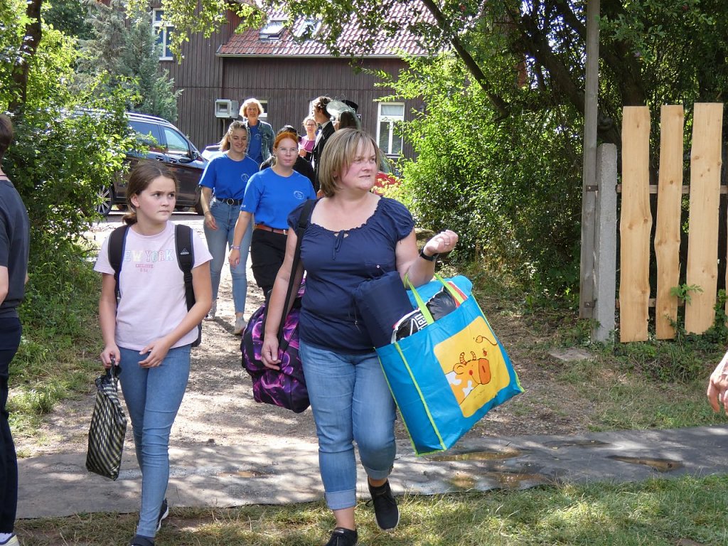 Pünktlich um 15.00 Uhr am Samstag warteten 40 Mitarbeitende in Eggerode auf die Ankunft der 60 Kinder, welche im Handwerkercamp teilnehmen wollten. Unter strahlend blauem Himmel begrüßte Maria Montessori, die diesjährige Hauptperson, die Kinder. Unverkennbar wuselten die in blau gekleideten Mitarbeitenden über das Gelände und freuten sich auf das Camp.