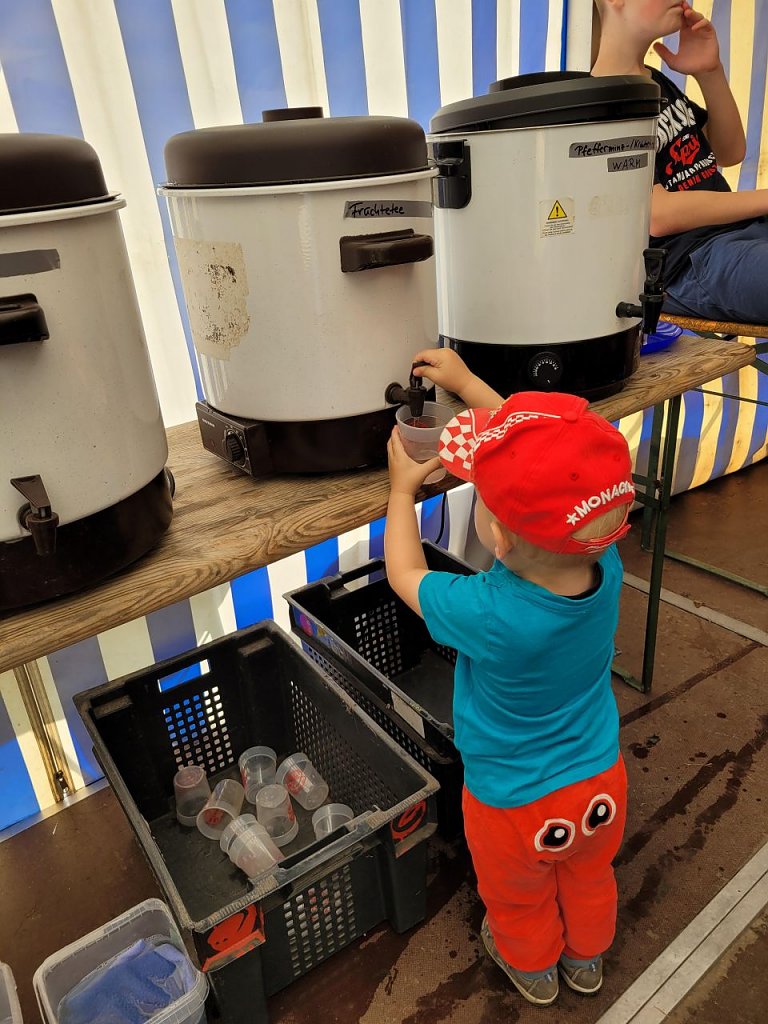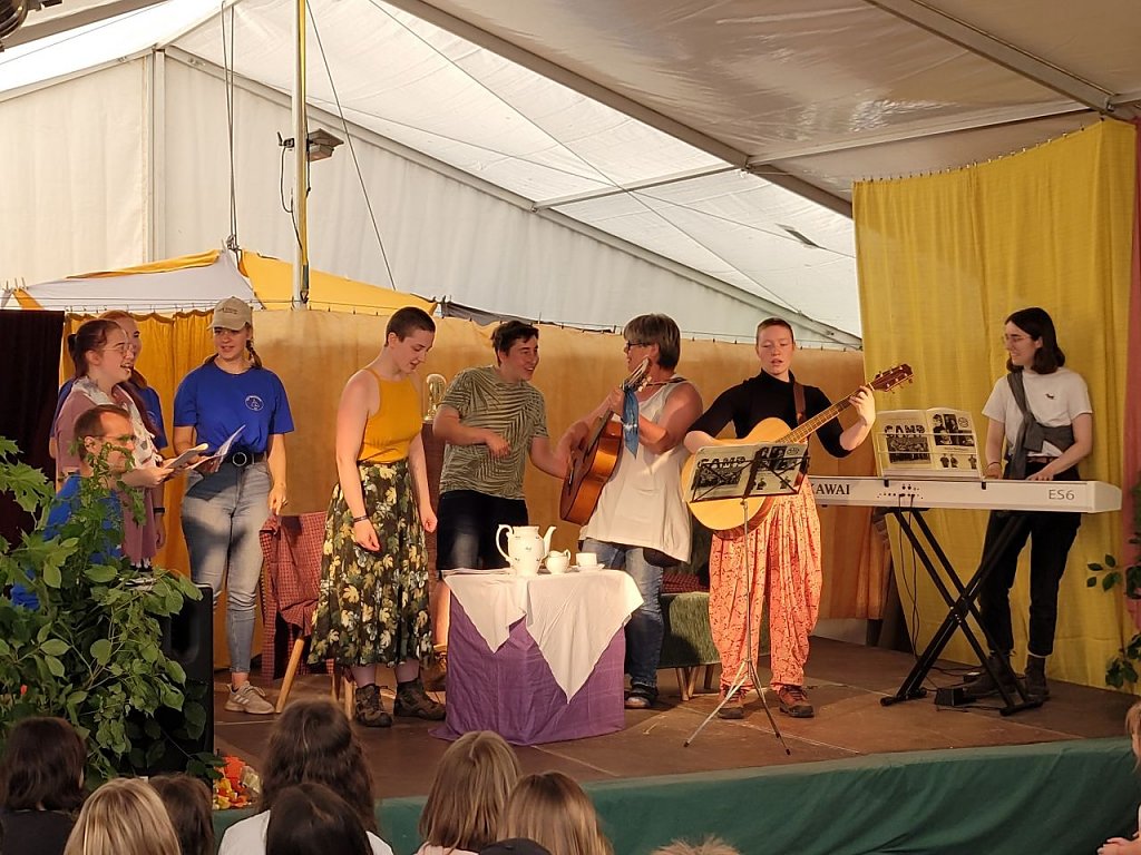 Nach einem leckeren Abendbrot, was wir der ehrenamtlichen Küche zu verdanken haben, ging es los mit Spiel und Spaß. Es konnten Süßigkeiten im La Casa de la Süßigkeiten erworben werden, die Hüpfburg getestet werden und Lieder gesungen werden. Die gute Stimmung setze sich im Theaterstück fort, als das Leben von Maria Montessori vorgestellt wurde. Die junge Maria hat weniger Spaß am Stoff in der Schule und möchte lieber durch Spaß lernen, was die Lehrerin und der Direktor natürlich nicht gerne sehen. Im Armenviertel der Stadt Rom lernen wir eine besorgte Mutter kennen, welche im Anschluss beim Begrüßungsabend die Zelte mit ihren Namen wie Fährbooten, Masci-Pizza-Razzi, Die Aufsteiger und vielen mehr vorstellt.