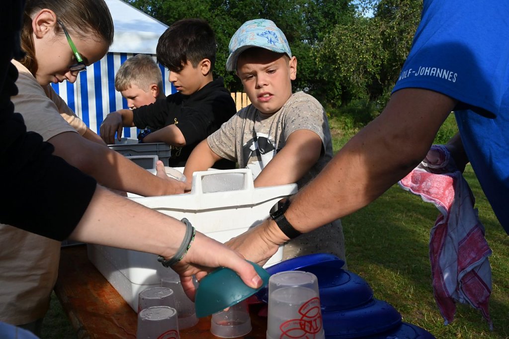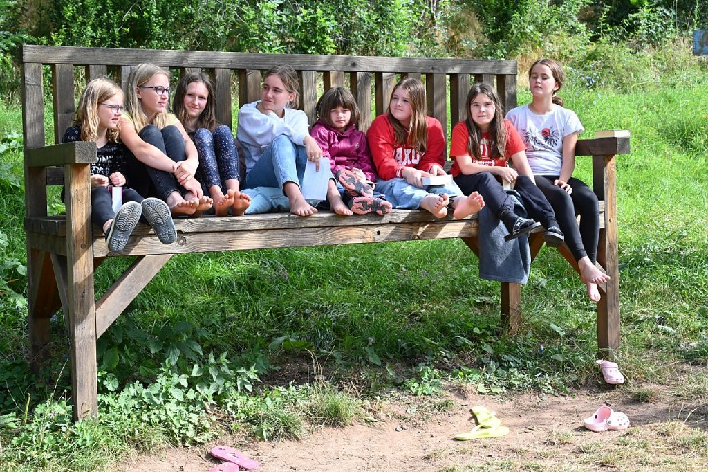 Nach einer erholsamen Nacht und einer schönen Morgenandacht freuten sich alle Teilnehmenden über das Frühstück. Direkt im Anschluss wurde das erste Mal von zwei Zelten abgewaschen, im La Casa de la Süßigkeiten eingekauft und an der Lagerkasse Geld eingetauscht. Im Anschluss folgten unzählige Lieder aus dem Campheft, begleitet von unserer Camp-Band. Das Theaterstück erzählte heute von Marias Kinder- und Jugendzeit. In der Grundschule war Maria keine klassische Musterschülerin, denn das damalige Auswendiglernen und nachsprechen im Schulsystem entsprachen nicht ihren Vorstellungen von Unterricht und Lernen. So erfahren wir, dass sie in der Grundschule viermal die Klasse wiederholen musste. Sie erkennt, dass sie ihrem Ziel, den Armen zu helfen, nur näherkommt, wenn sie lernt und das beflügelt ihren Lerneifer. So besteht Maria die Prüfungen mit Bestnote und überrascht ihre Eltern mit ihren Zukunftsplänen: ein Medizinstudium. Auf dem Weg dorthin werden ihr Steine in den Weg gelegt, denn es herrschen absurde Vorstellungen von studierenden Frauen im Jahr 1885. Ob und wie Marias Weg weitergeht erfahren wir morgen im Theaterstück. Wie jedes Jahr schließt sich auch dieses Jahr die Bibelarbeit an das Theaterstück an. Wir sprachen über unser eigenes Leben, ob wir immer den Mut haben unsere Ziele zu verfolgen und Meinungen zu vertreten, egal was andere Denken und wie es uns damit geht. Am Nachmittag starteten das erste Mal die Handwerke.