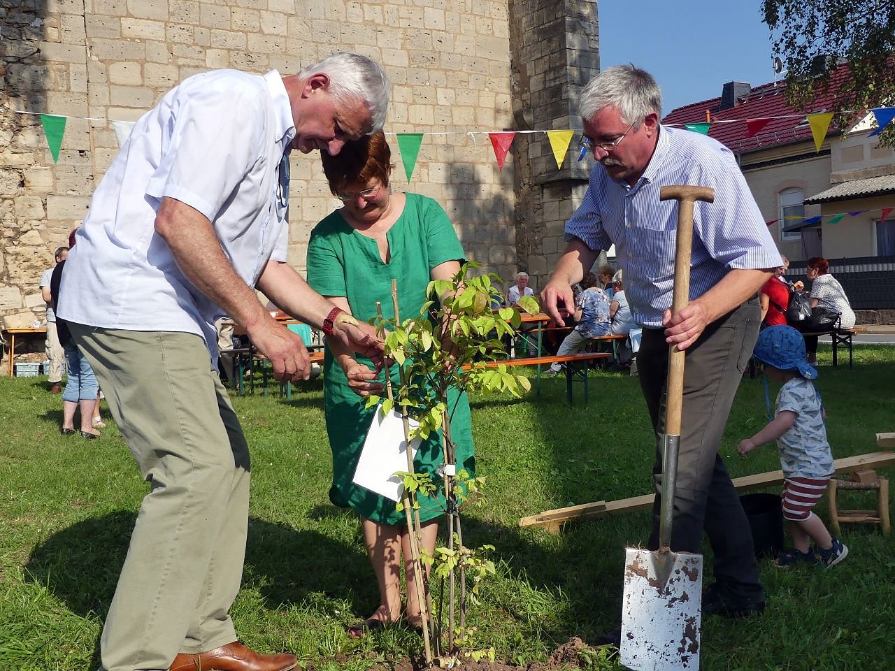 Im Anschluss überreichten Superintendent Andreas Schwarze und der Vorsitzende des Bau- und Finanzausschusses Stephan Domann einen Bienenbaum als Erinnerung an die Glockenweihe und als Dankeschön für ehrenamtliches Engagement. Er wurde noch am Nachmittag von den Beiden gemeinsam mit Kathrin Schwarze eingepflanzt und wird zukünftig die Bienen im Sommer mit seinen Blüten erfreuen. "Das war eine wunderbare Überraschung und eine tolle Idee zur Freude unserer Natur", strahlt Regina Englert begeistert. Die Gemeinde wird jetzt umso nachhaltiger an diesen Tag erinnert - mit Baum und nun auch erstmals wieder regelmäßigem Mittags- und Abendläuten. Dank der Elektrifizierung beider Glocken ist dies nun möglich. Und auch die über 300-jährige handaufgezogene Turmuhr schlägt wieder. "Sie ist der Herzschlag unserer Kirche und beruhigt mit ihrem Ticken, das im Gotteshaus gut zu hören ist", erzählt Regina Englert.