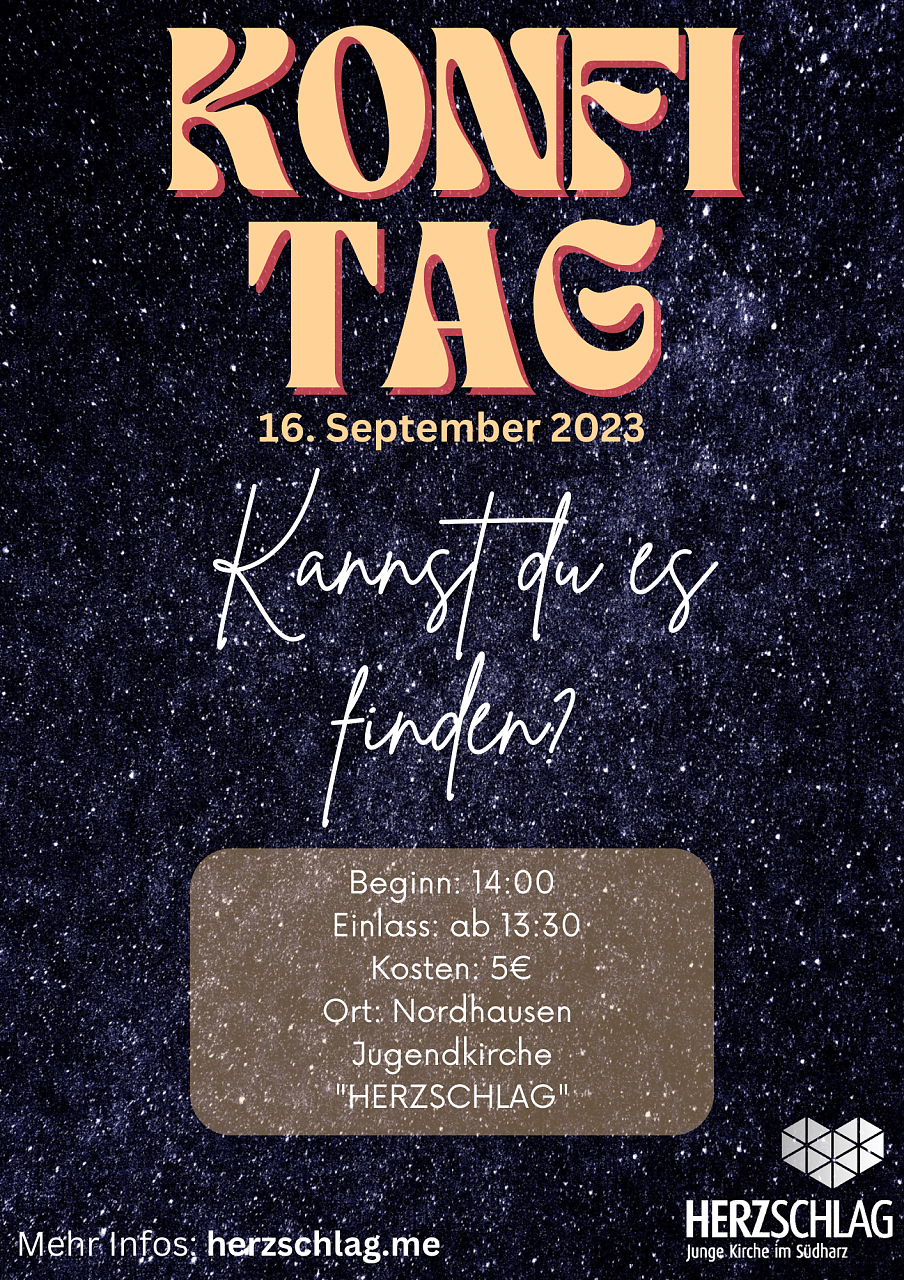 Einmal im Jahr findet für alle Konfirmandinnen und Konfirmanden der siebten und achten Klassenstufe der Konfitag statt. Dieses Jahr unter dem Motto: "Kannst du es finden?" Zu diesem Event treffen alle Konfigruppen des Kirchenkreises zusammen und erleben einen Tag gemeinsam mit: Bühnenprogramm mit Band, großer Nachmittagsaktion, Überraschungen, einem besonderen Gottesdienst, leckeren Snacks, Aktionen und Freizeitmöglichkeiten