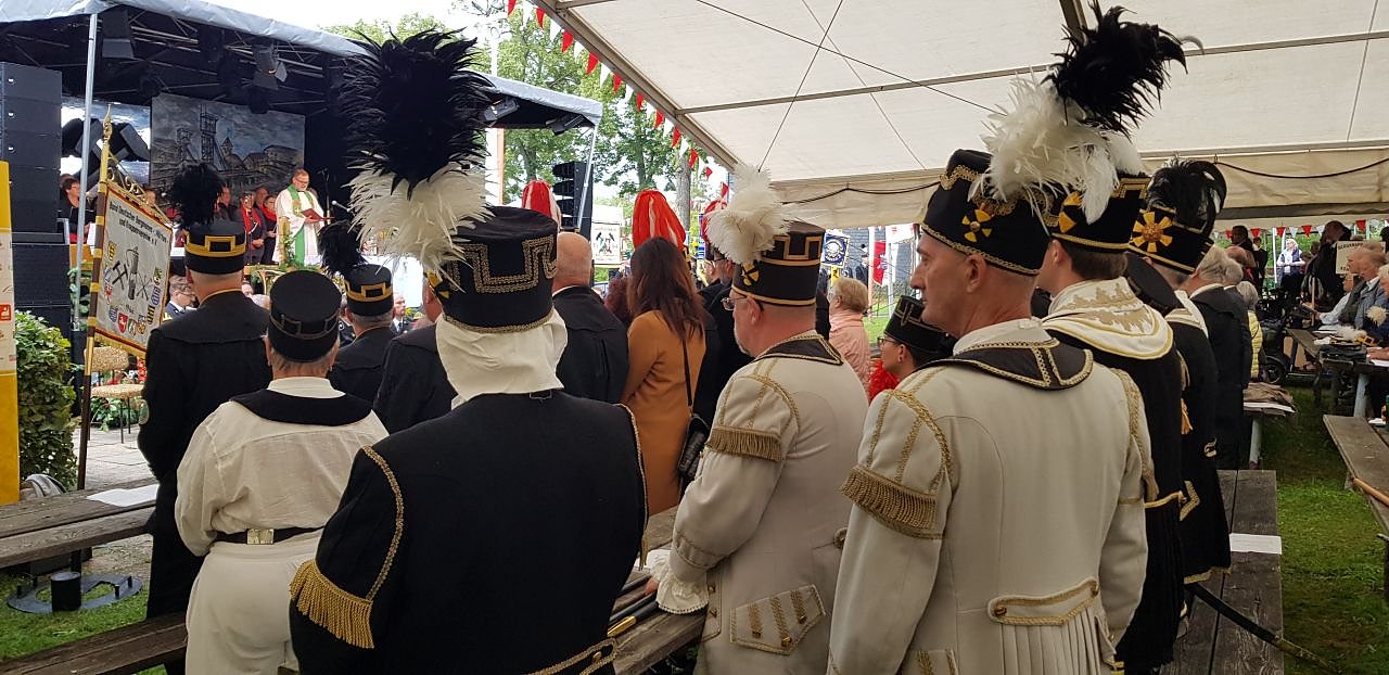(re) Die Zelte auf dem Festplatz in Bleicherode waren zum Berg-Gottesdienst am Sonntagmorgen gut gefüllt - hunderte Gottesdienstbesucher, darunter viele im Habit der Bergleute, saßen in den Reihen. Ein festlicher und musikalisch schwungvoller Gottesdienst erwartete sie. Anlass war der 5. Thüringer Bergmannstag.