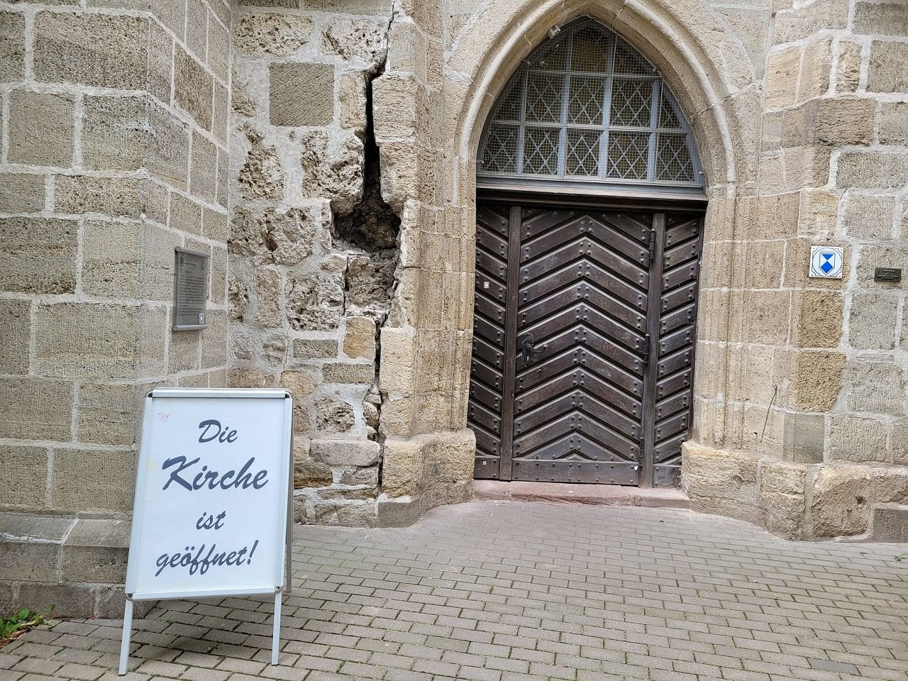Dadurch wissen wir, dass die beobachteten Risse und Fugenschäden durchaus im erwartbaren Bereich liegen, erklärt der Pfarrer. Natürlich müssten Risse und Fugen trotzdem immer wieder geschlossen werden, um eindringende Feuchtigkeit zu begrenzen. Diese Arbeiten sind durch die Kirchengemeinde beauftragt und finden gerade statt, sind aber durchaus komplex. Wie derzeit am Eingang gut zu sehen ist, werden Risse zunächst teilweise weiter geöffnet, um ein vollständiges Schadensbild zu erhalten. Das sieht für die Passanten erschreckend aus, doch erst dann können Planer, Statiker und Bauingenieure über den bestmöglichen Weg der Sanierung beraten und entscheiden. Und letztlich müssen auch noch die ausführenden Fachfirmen freie Kapazitäten haben. Das alles dauert gerade länger, als wir erhofft und geplant haben – aber wir sind auf einem guten Weg, bestätigt Wolf-Johannes von Biela.